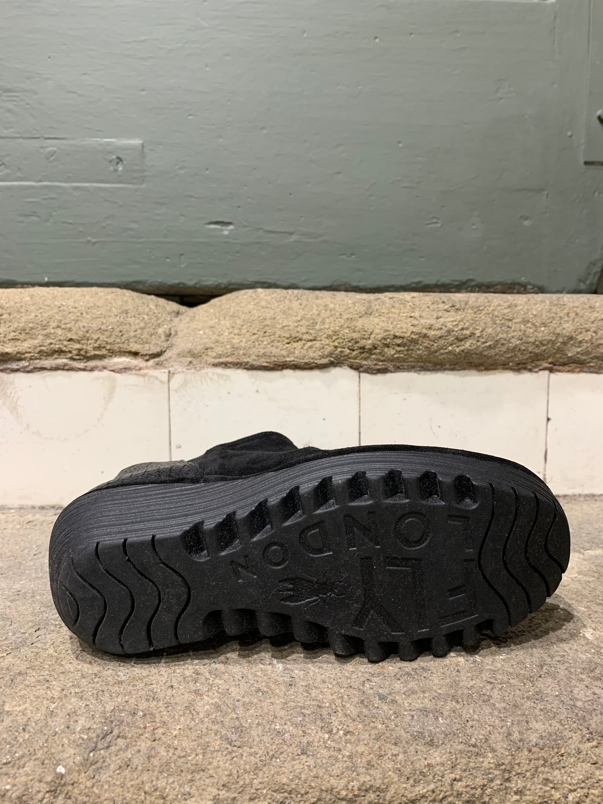 Bota negra de ante en la parte delantera y piel con efecto cocodrilo en la parte trasera. Suela de goma negra. En la parte interior incluye una cremallera.