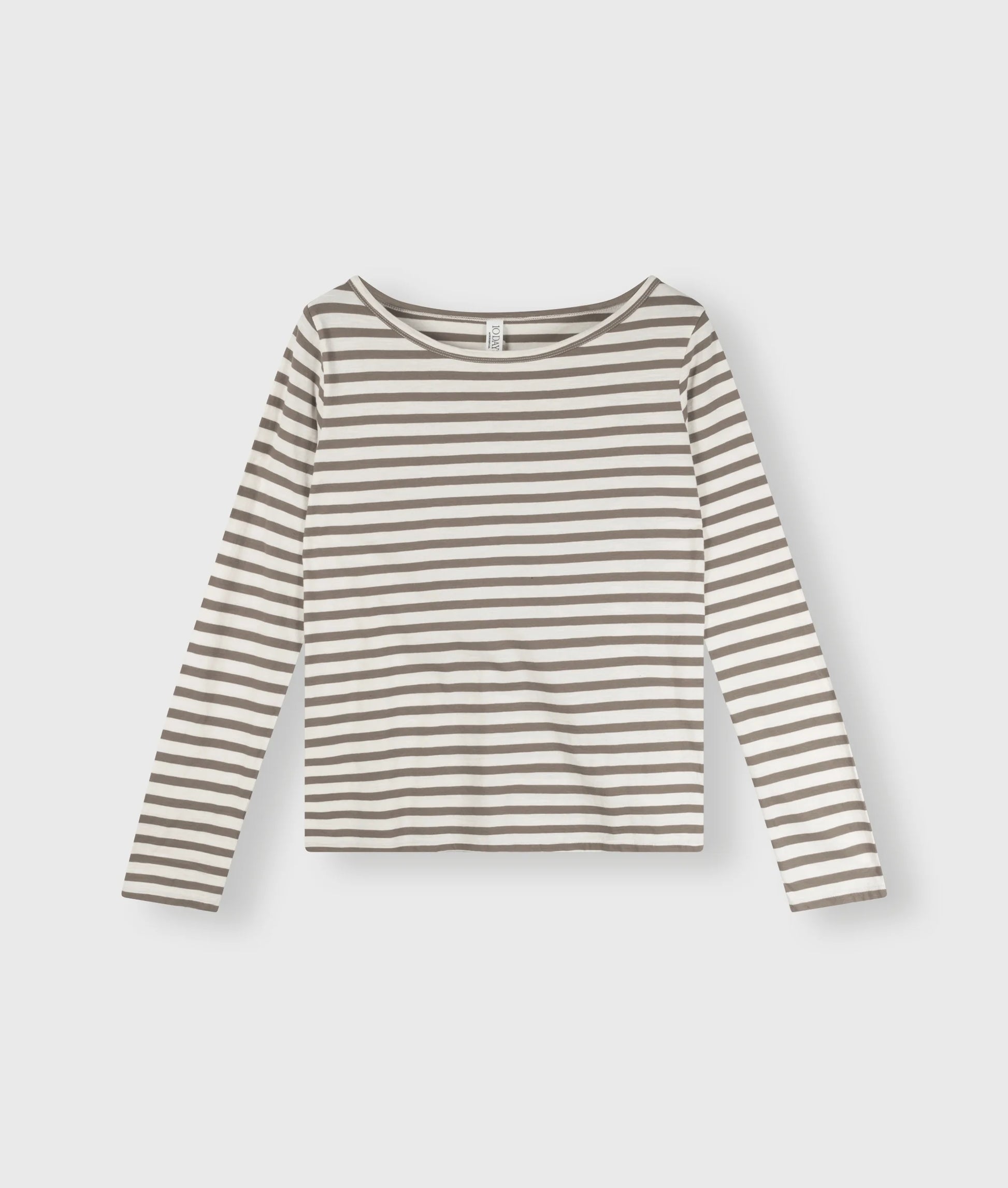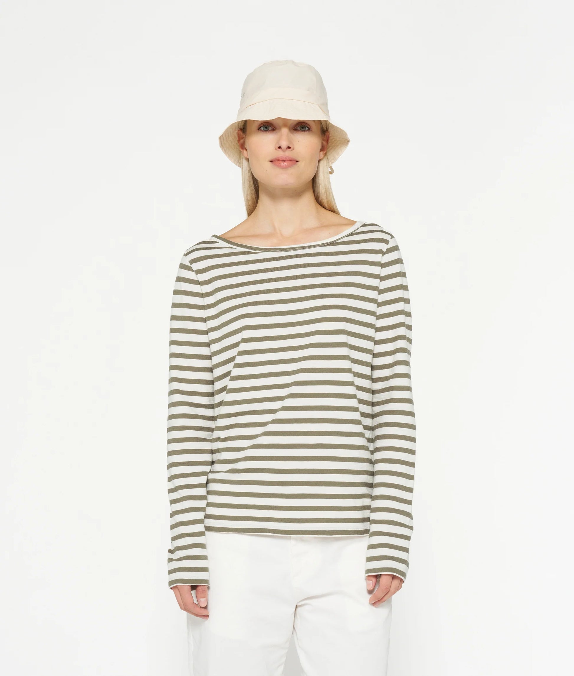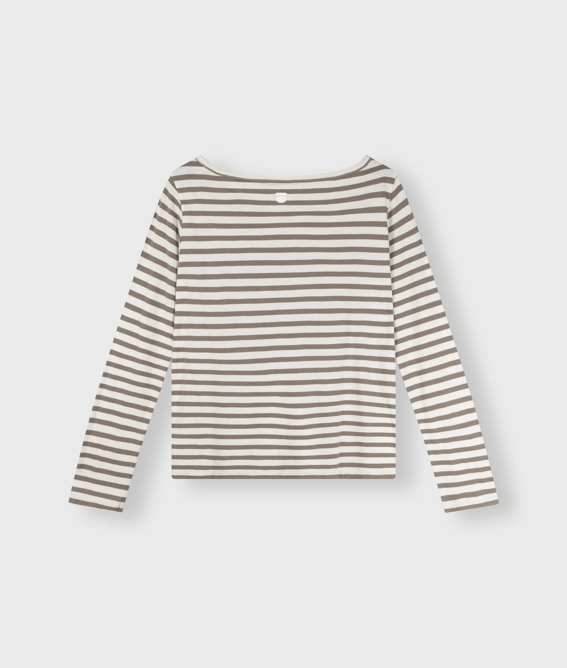 Top de rayas regular fit, manga larga y cuello redondo, confeccionado en punto de algodón. Presenta pequeñas aberturas en la parte inferior de las costuras laterales, una aplicación de manga baja y una medalla bordada en la espalda, justo debajo del escote.