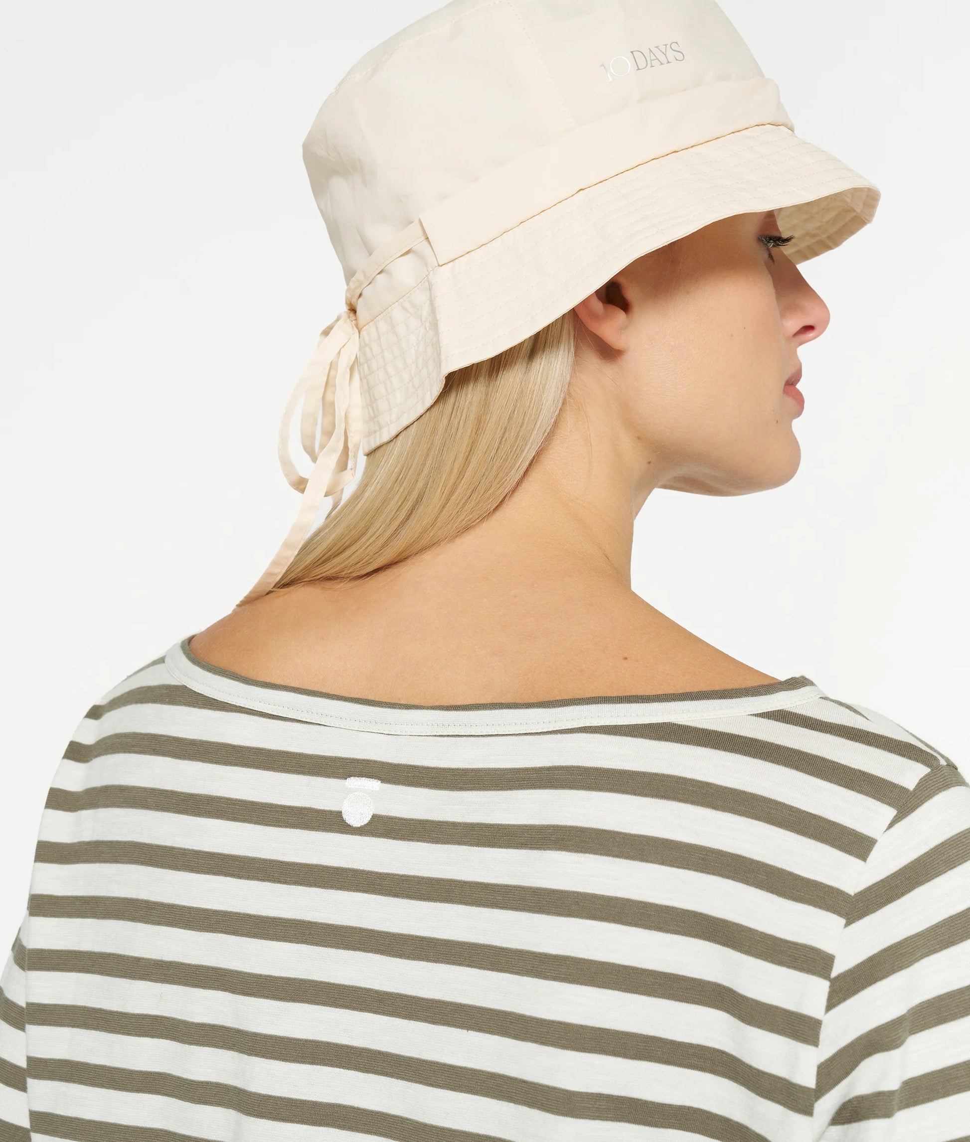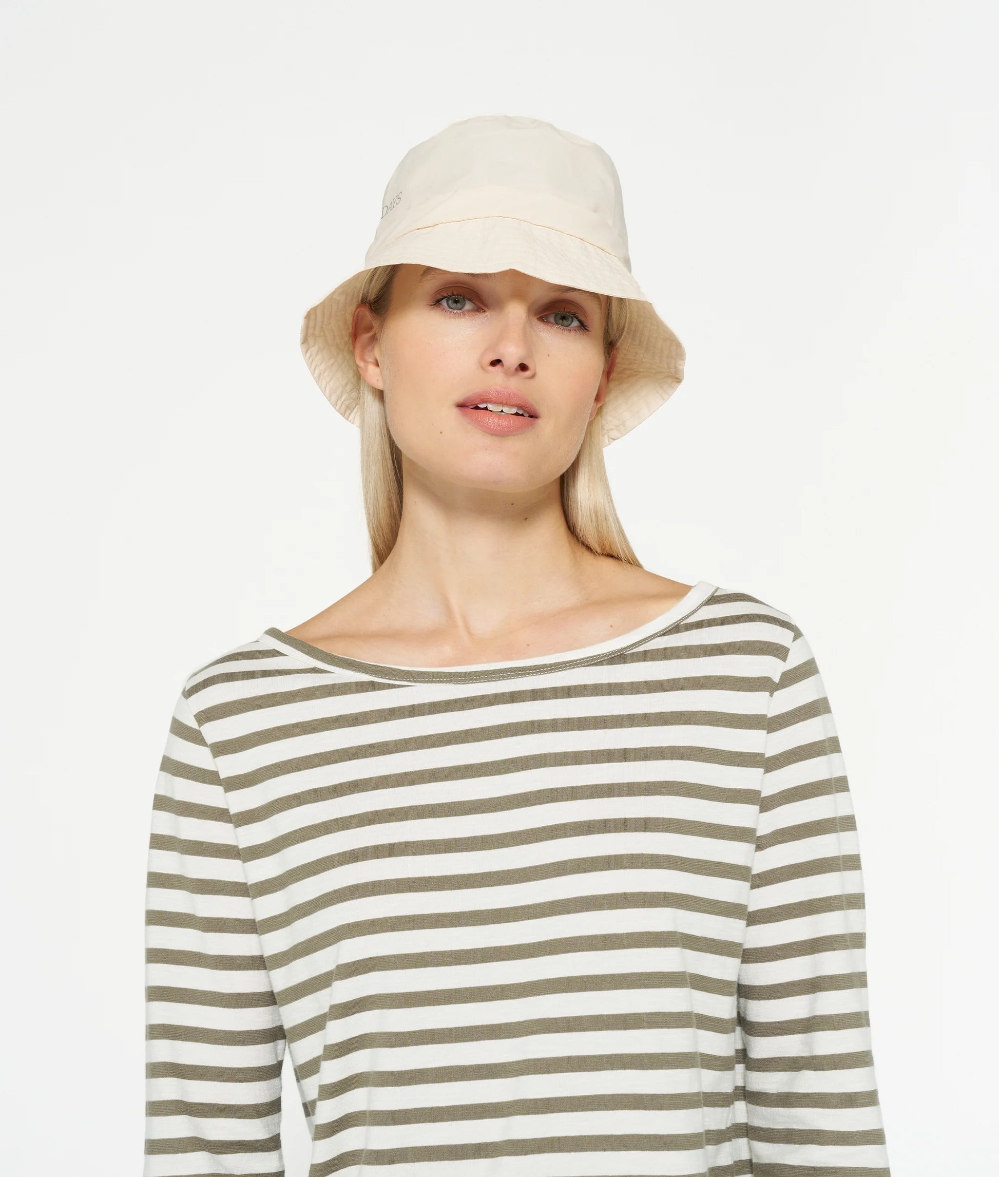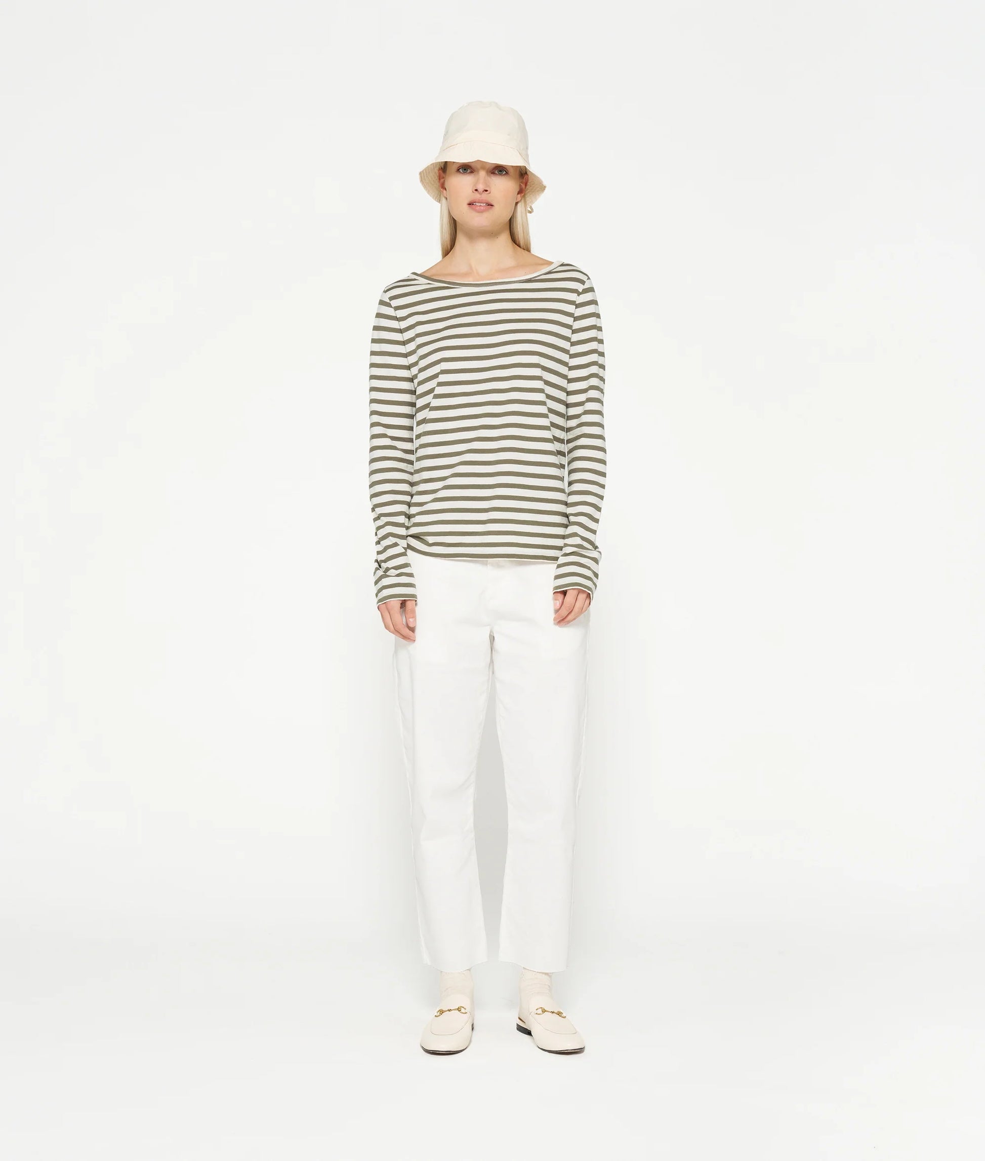 Top de rayas regular fit, manga larga y cuello redondo, confeccionado en punto de algodón. Presenta pequeñas aberturas en la parte inferior de las costuras laterales, una aplicación de manga baja y una medalla bordada en la espalda, justo debajo del escote.