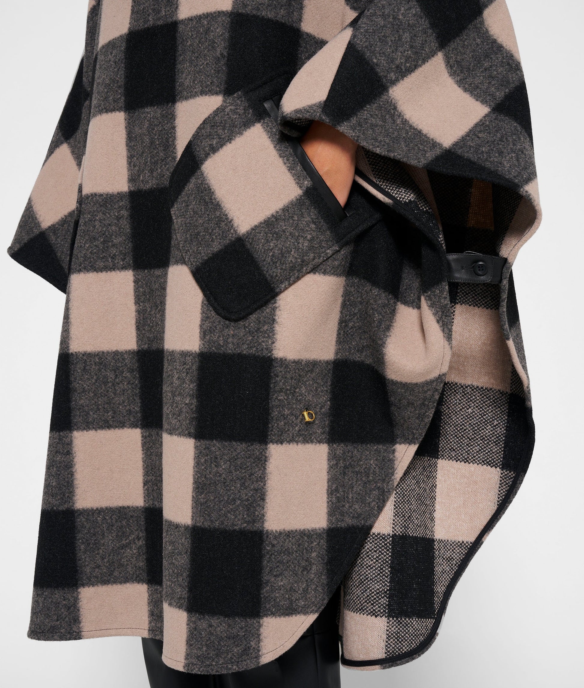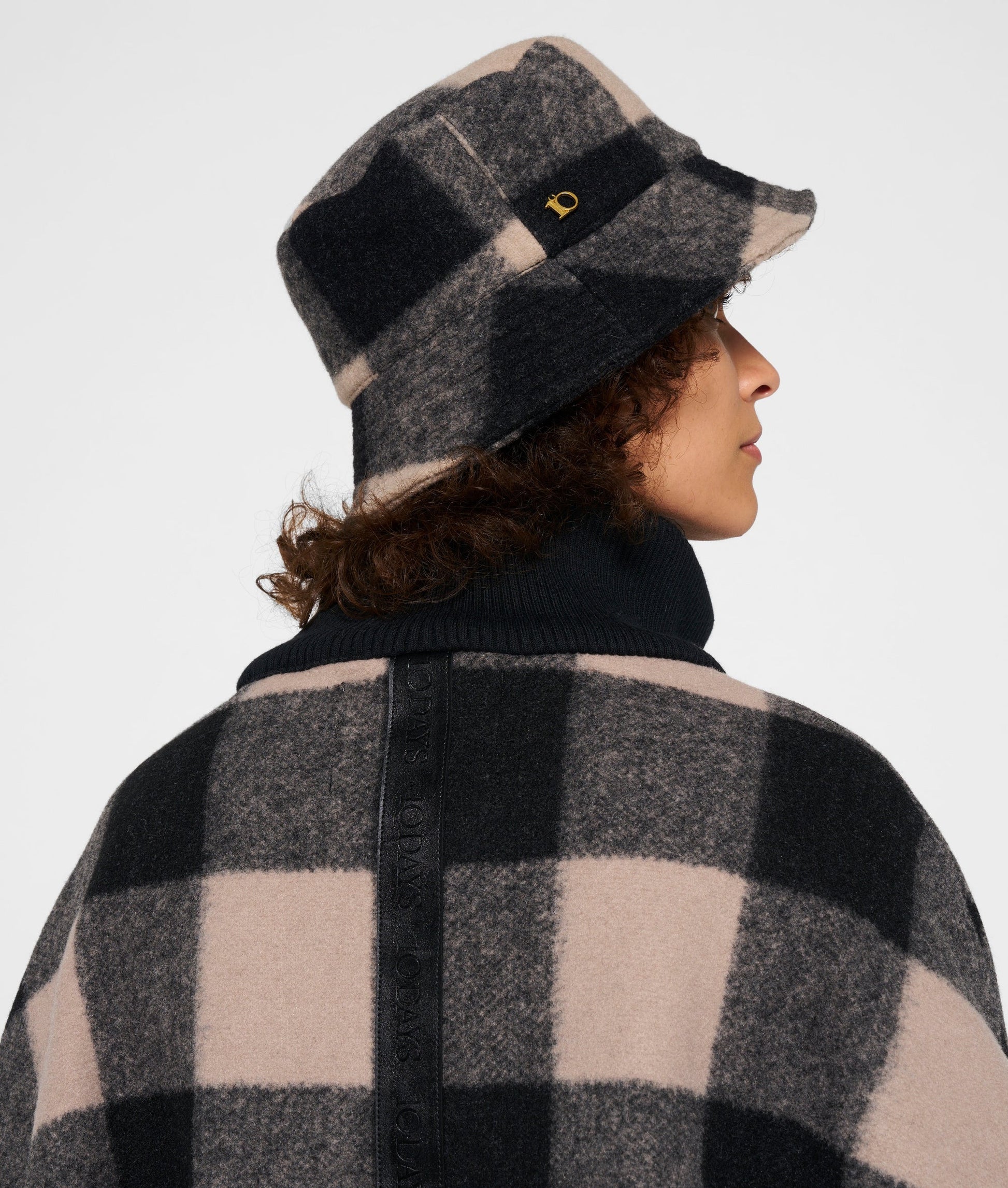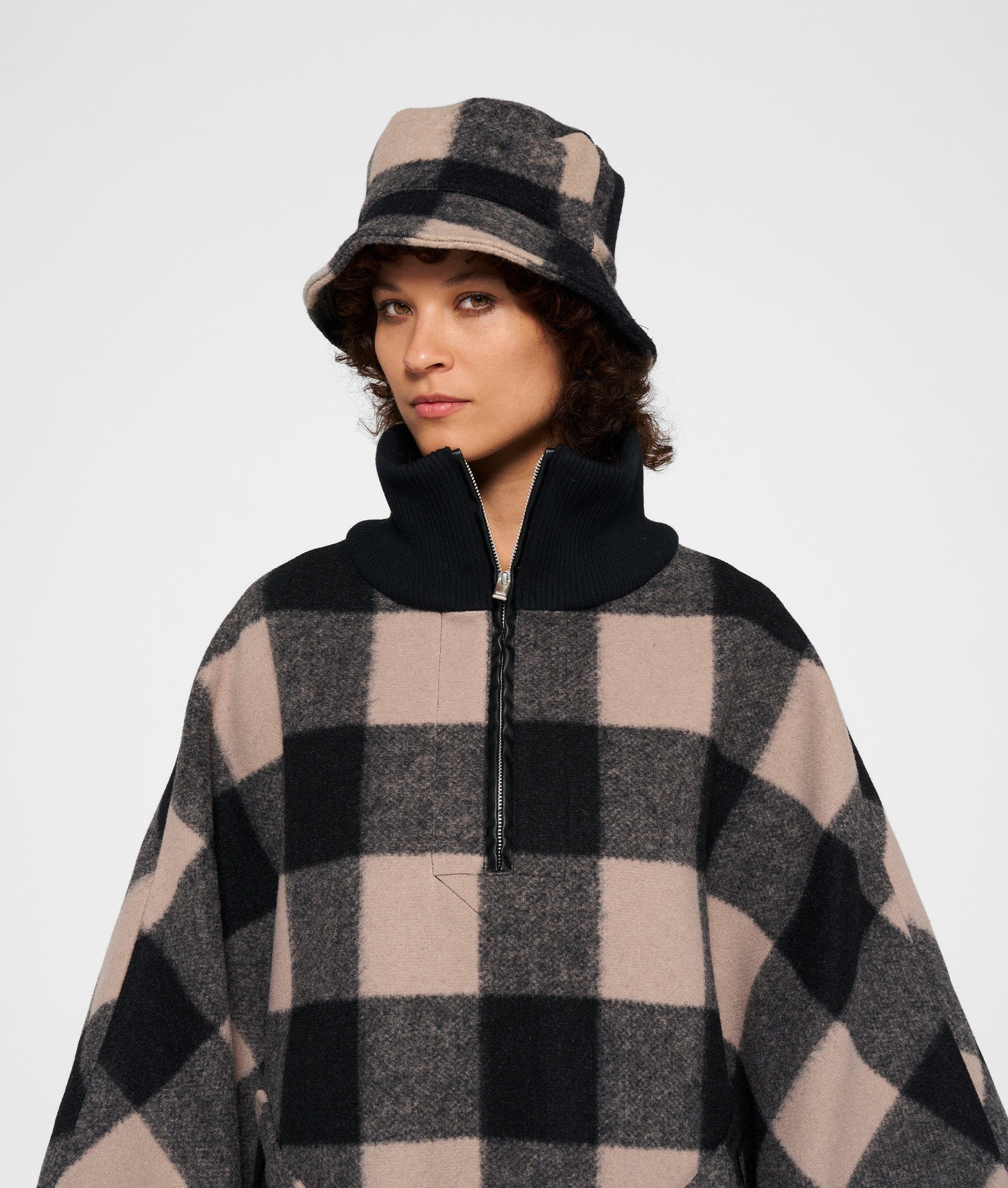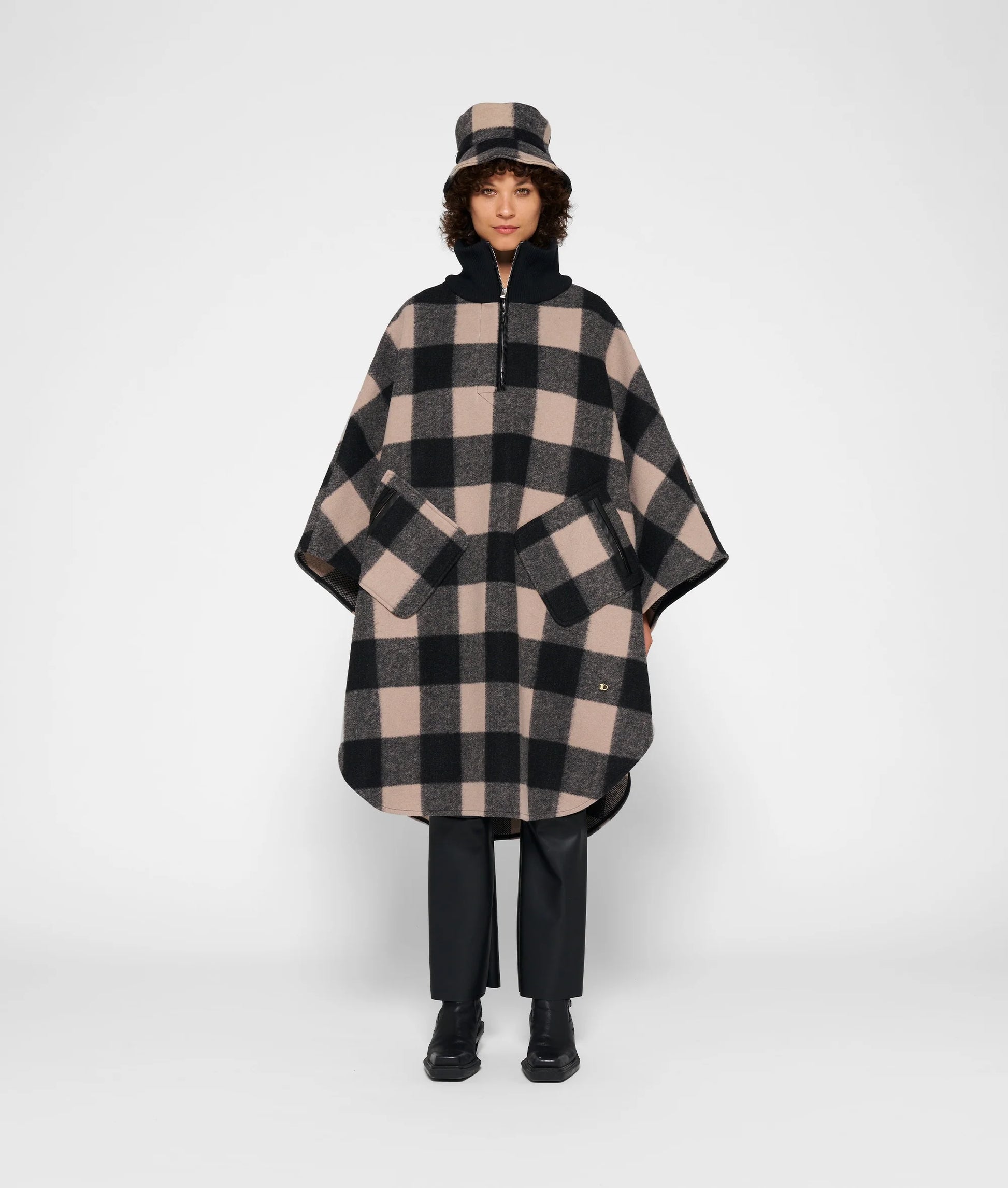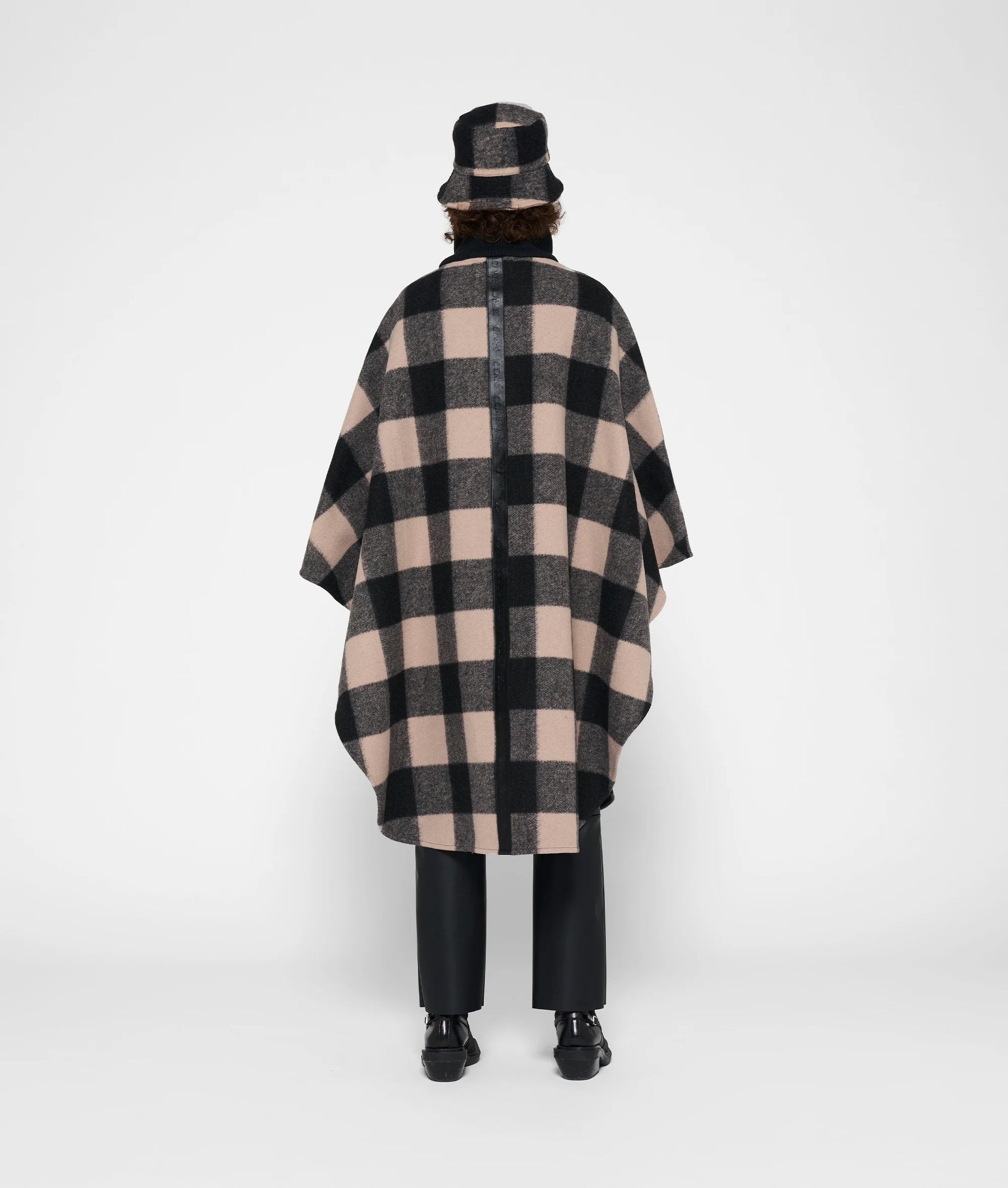 Capa oversize fit con estampado de cuadros, confeccionada en una mezcla de lana resistente y cálida. Presenta un cuello alto de punto acanalado con cremallera, bolsillos laterales inclinados parcheados, un ribete con apariencia de cuero en la parte posterior con logotipos prensados, cierres de botones debajo de las sisas y una cuenta dorada '10' en la parte delantera debajo del bolsillo izquierdo.