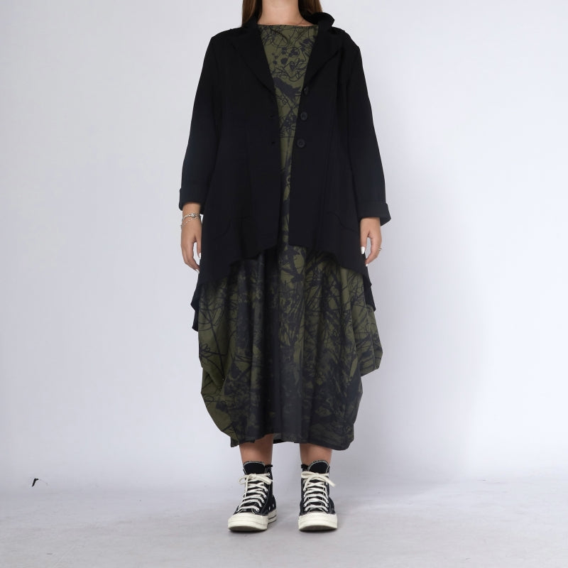 Chaqueta tipo levita de algodón y poliéster. Corte laser. Dos bolsillos frontales. Parte trasera ligeramente más larga. Cuello smoking, hombros rectos y manga larga. Corte ceñido cintura.