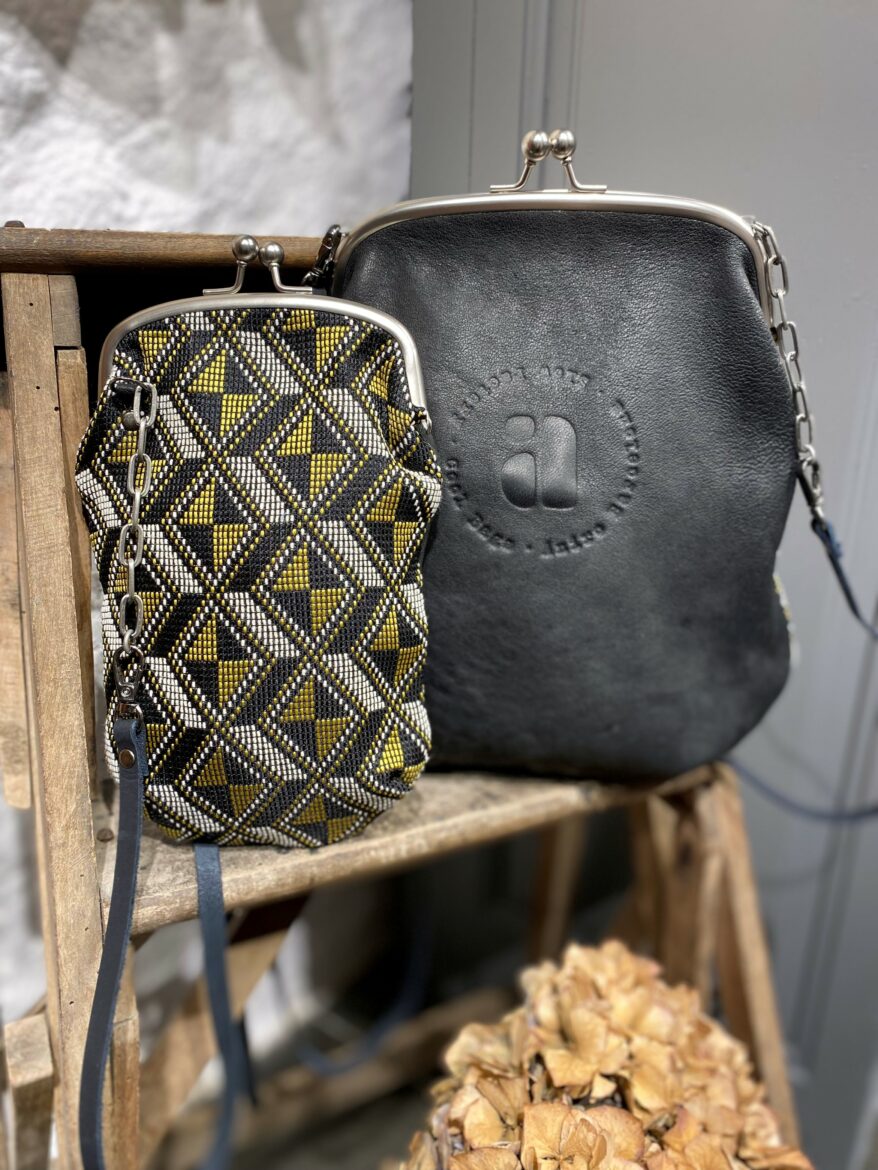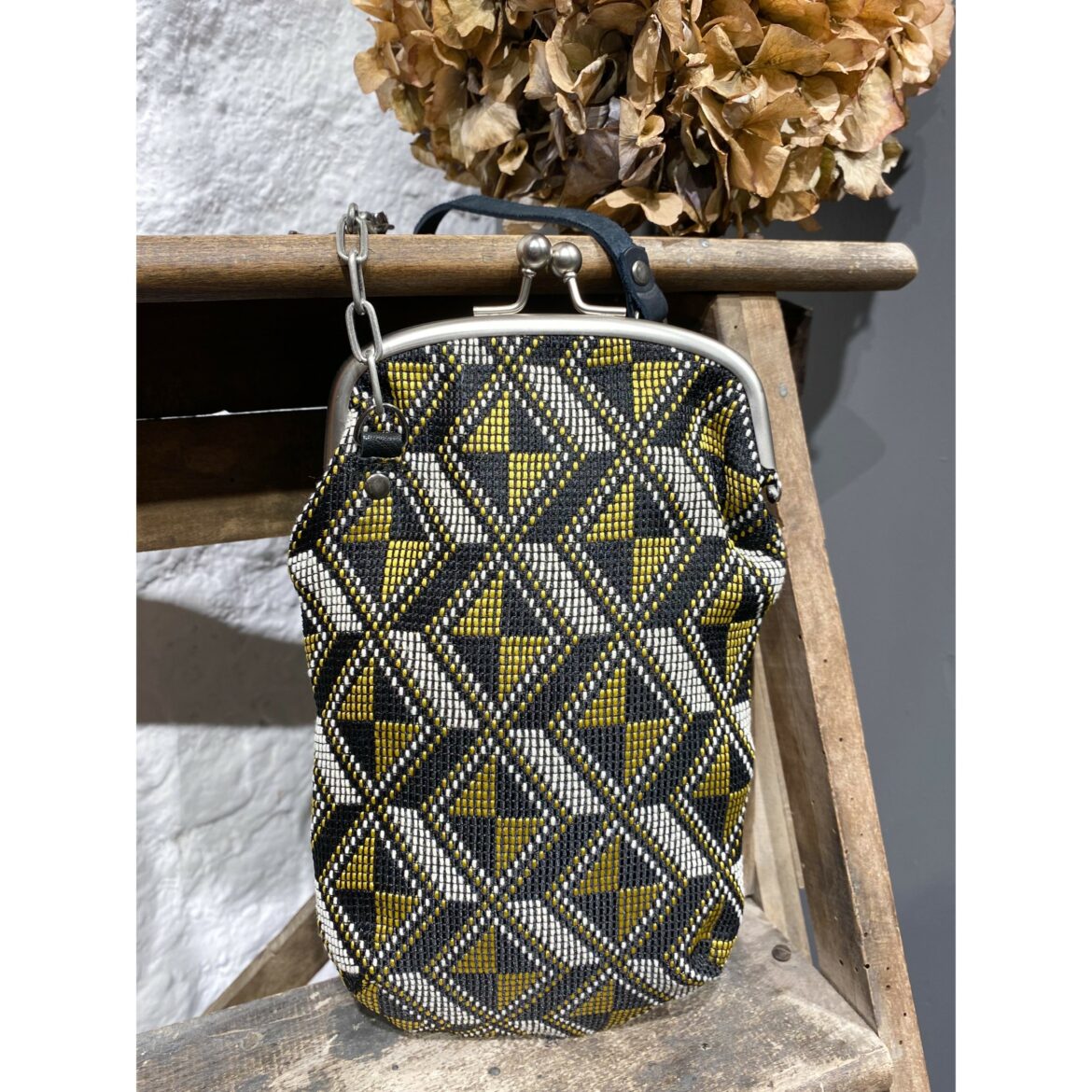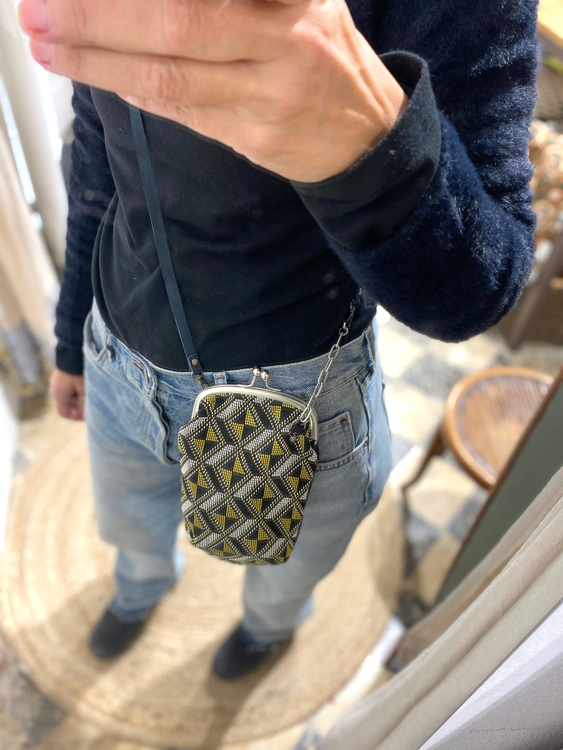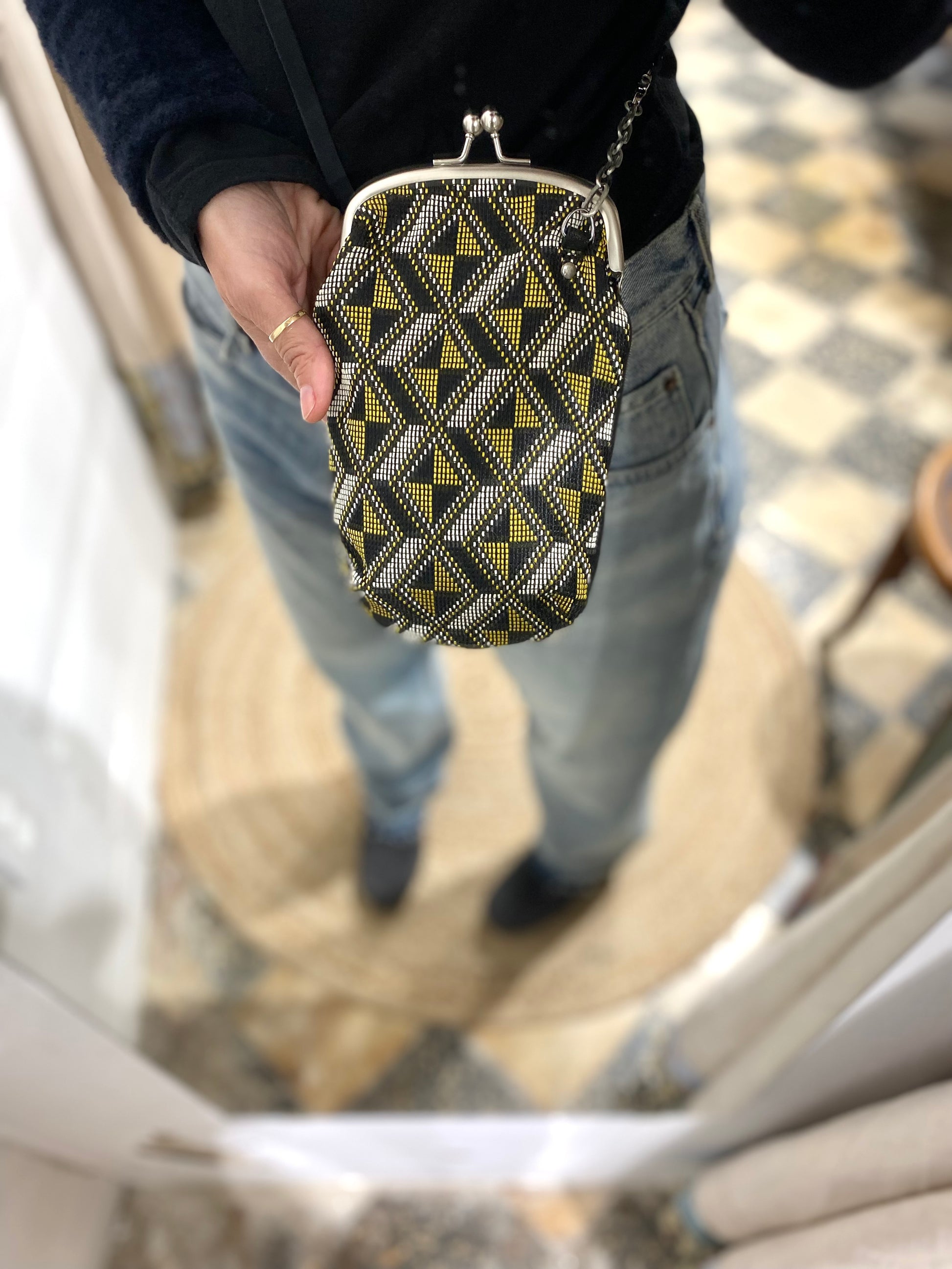 Exterior: Bolso bandolera de piel un lado y tejido de Jacquard el otro, con cierre boquilla de metal. Ligero, apto para móvil y cosas pequeñas. Asa con mosquetones para quitar la tira y llevar el bolso de mano o utilizarlo de estuche