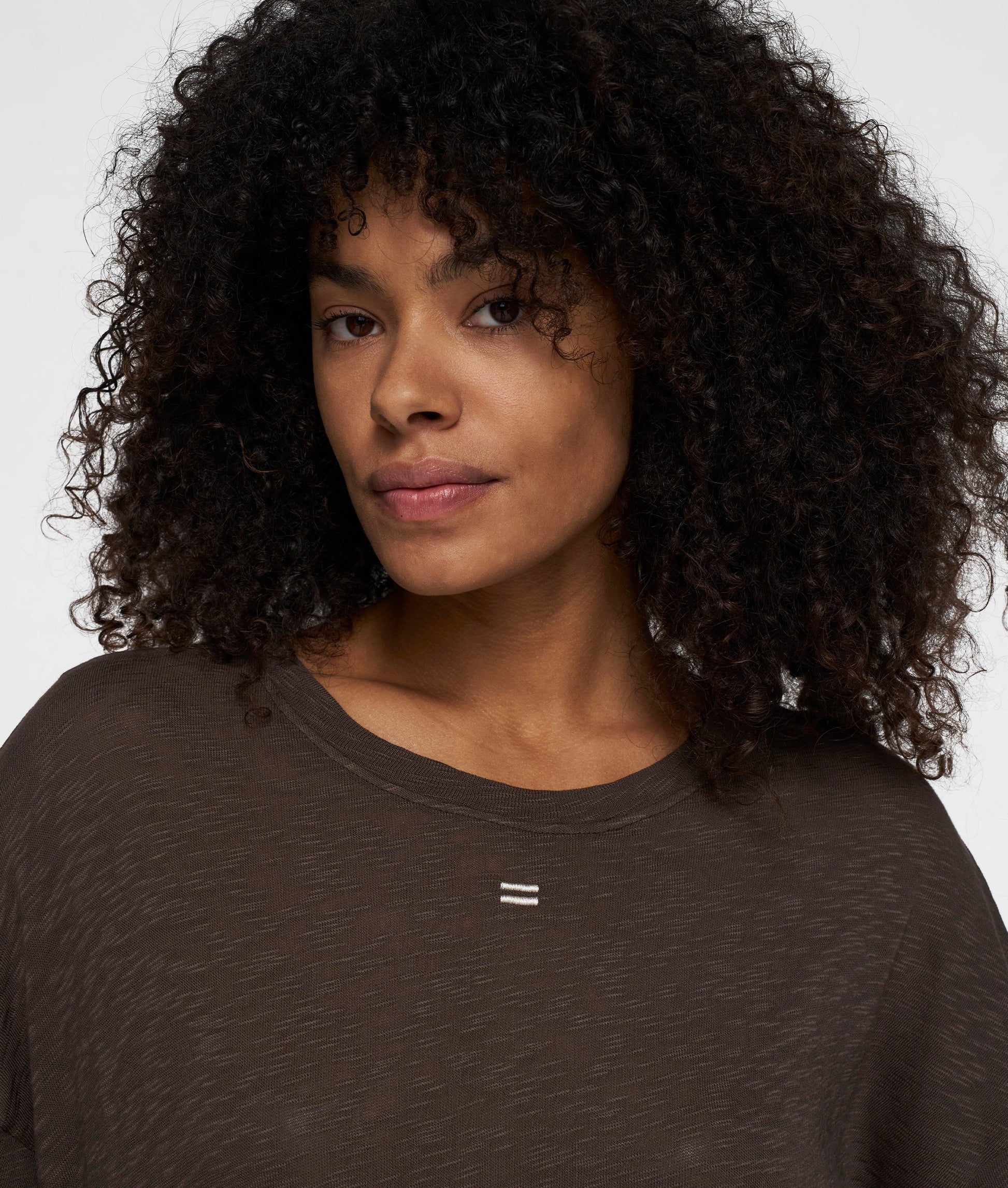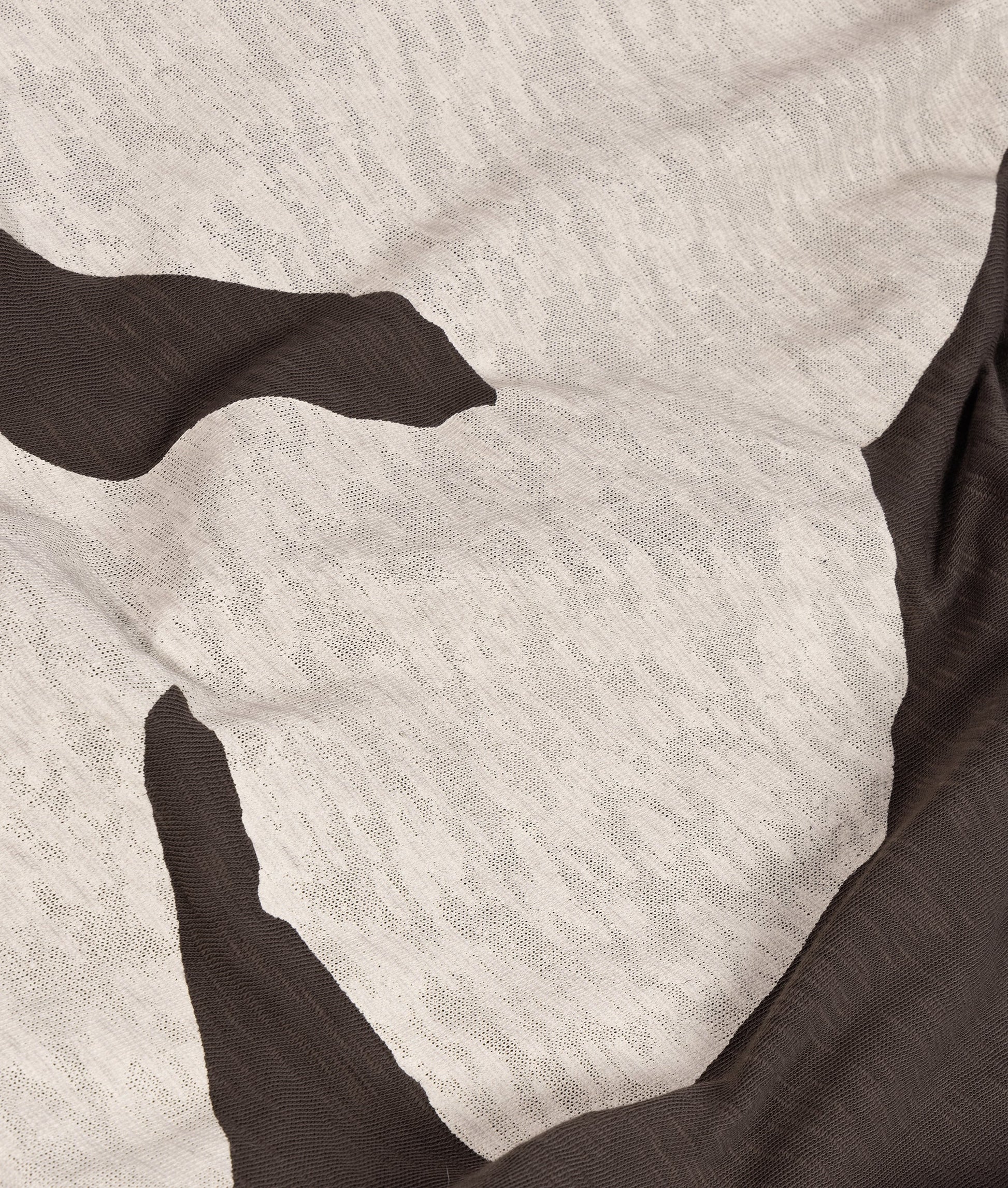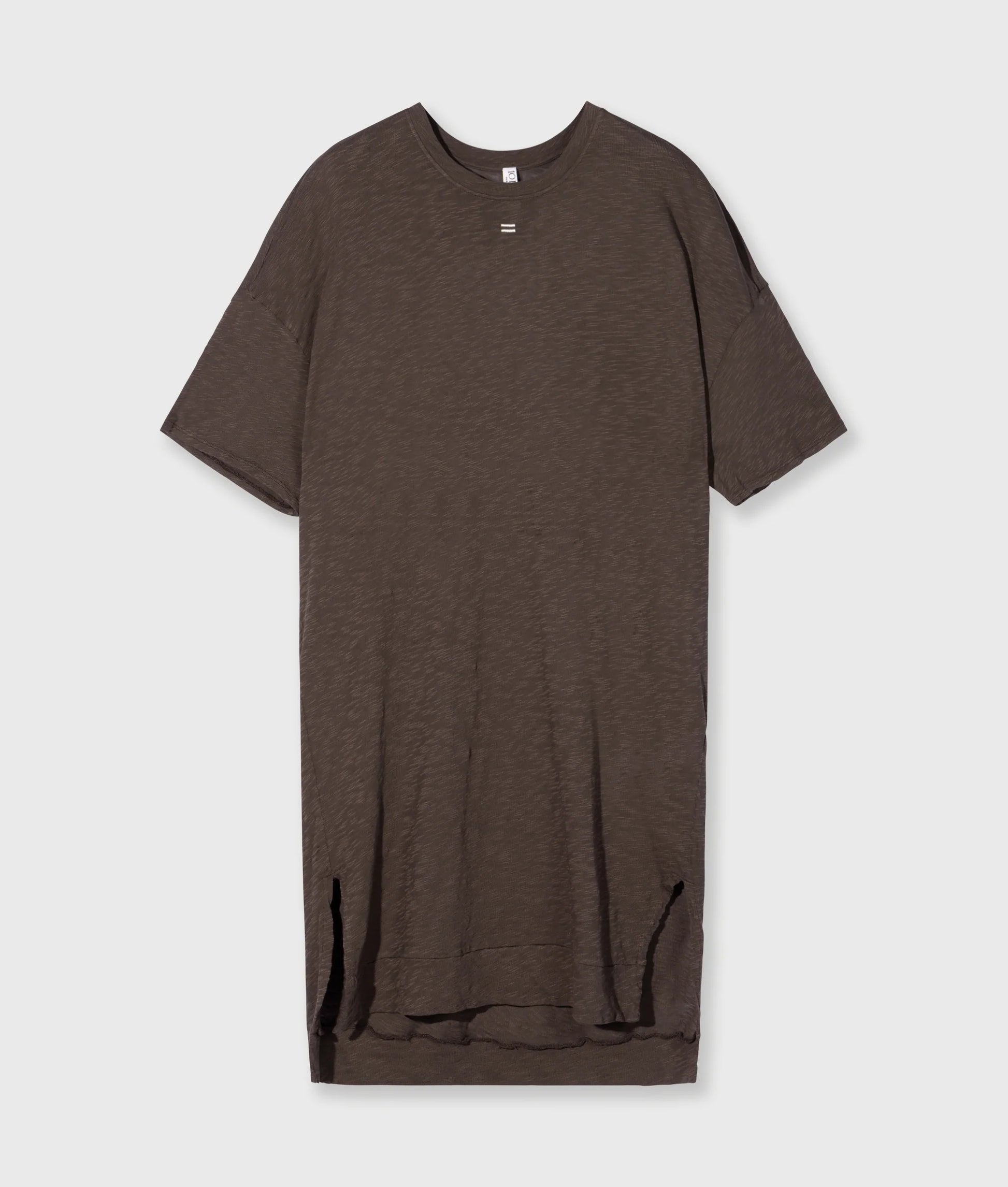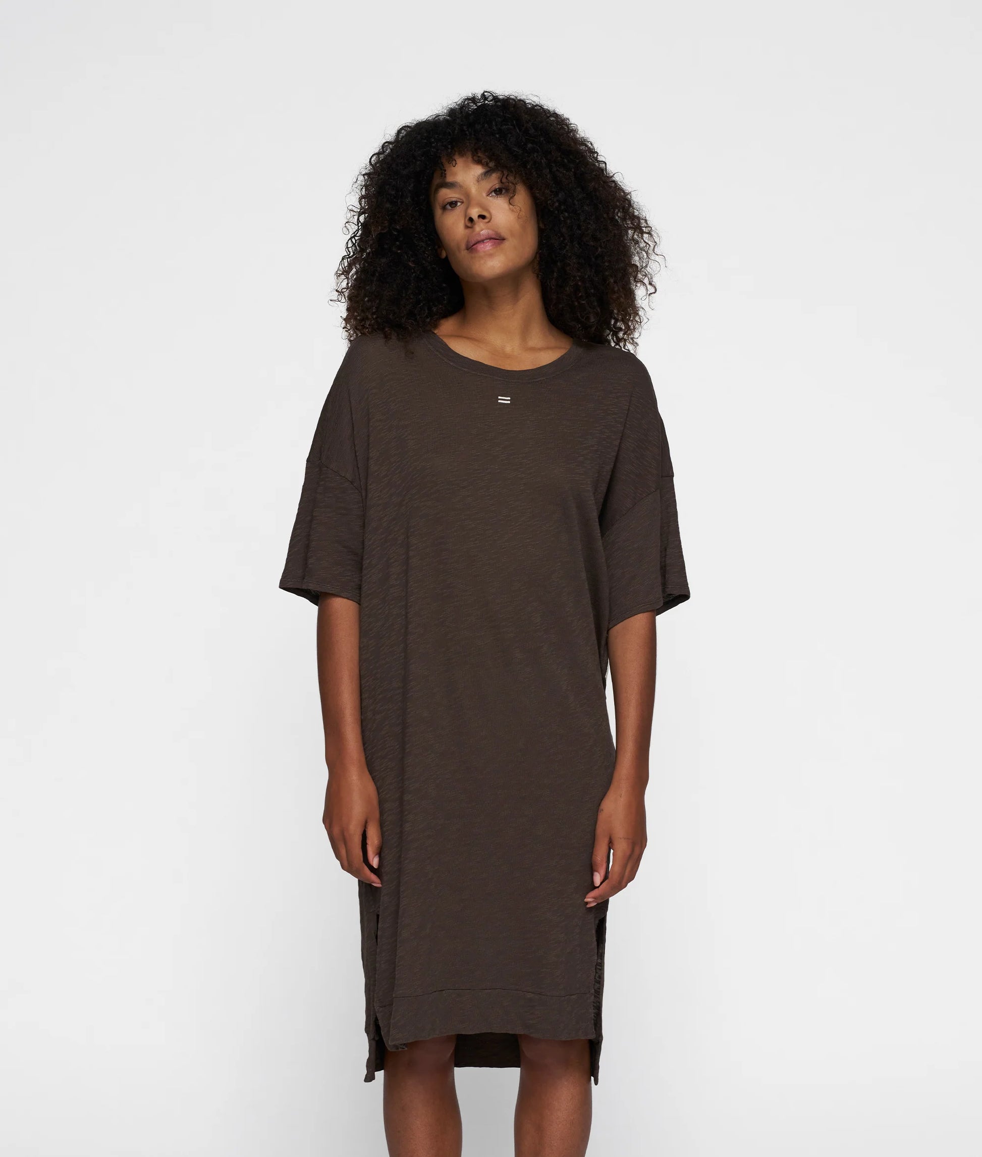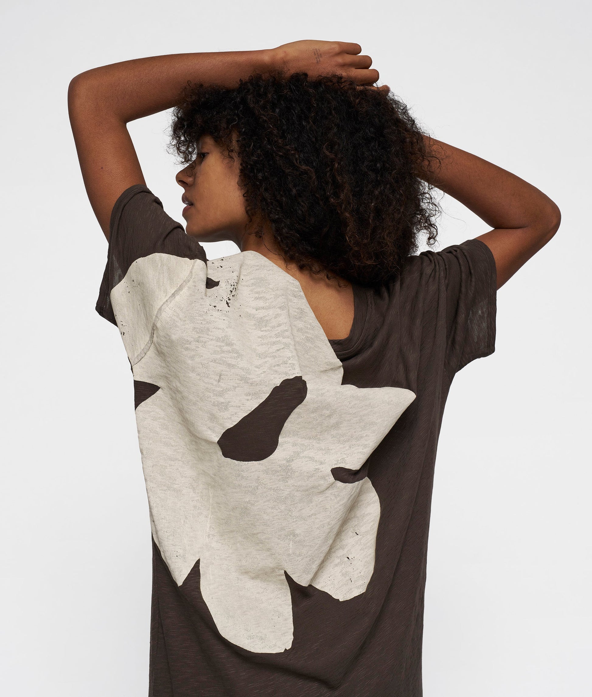 Vestido estilo camiseta midi de corte regular en punto flameado de algodón orgánico con certificación GOTS. Presenta un estampado floral en la espalda, un logo de minirayas bordado en el pecho y aberturas laterales.