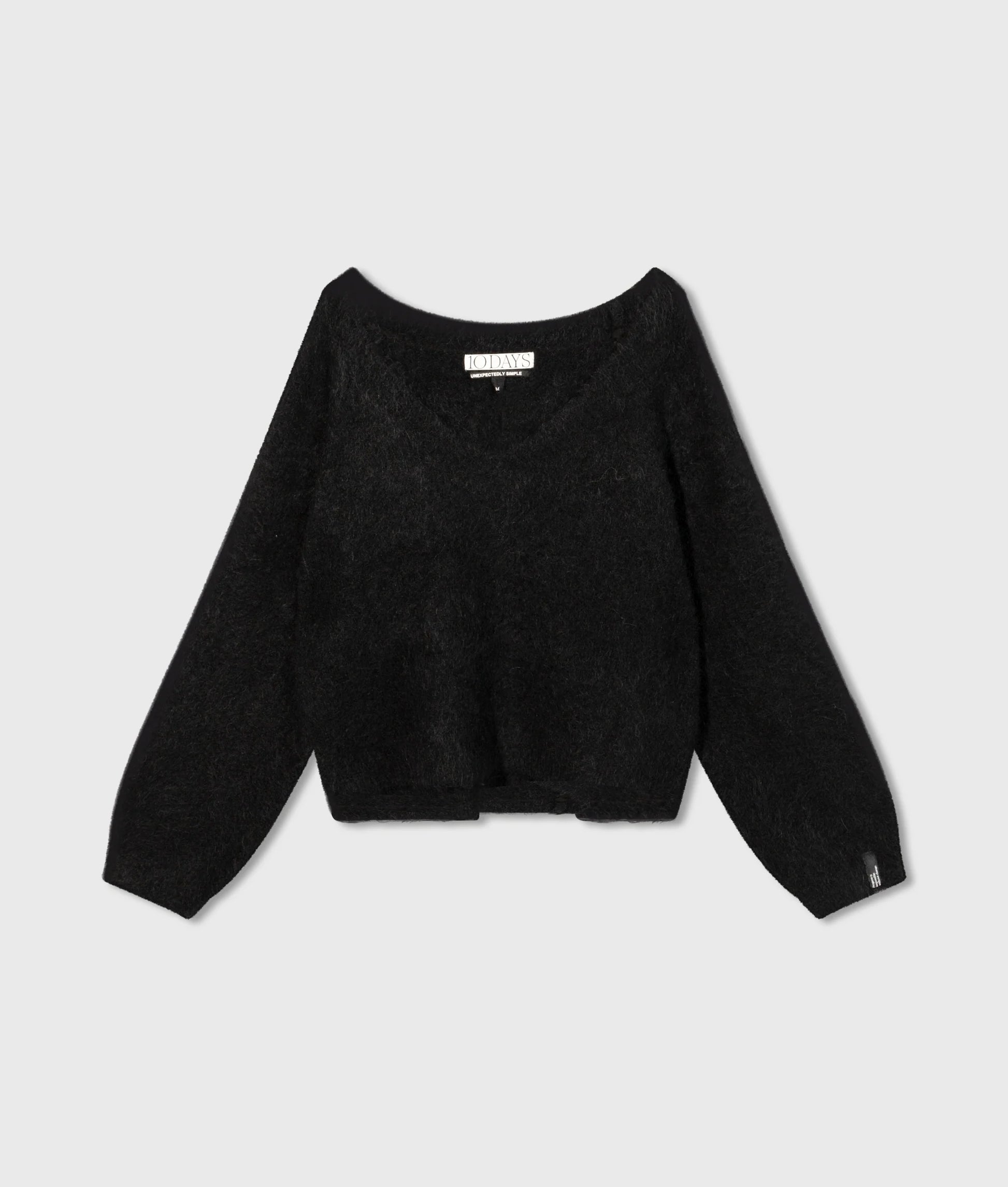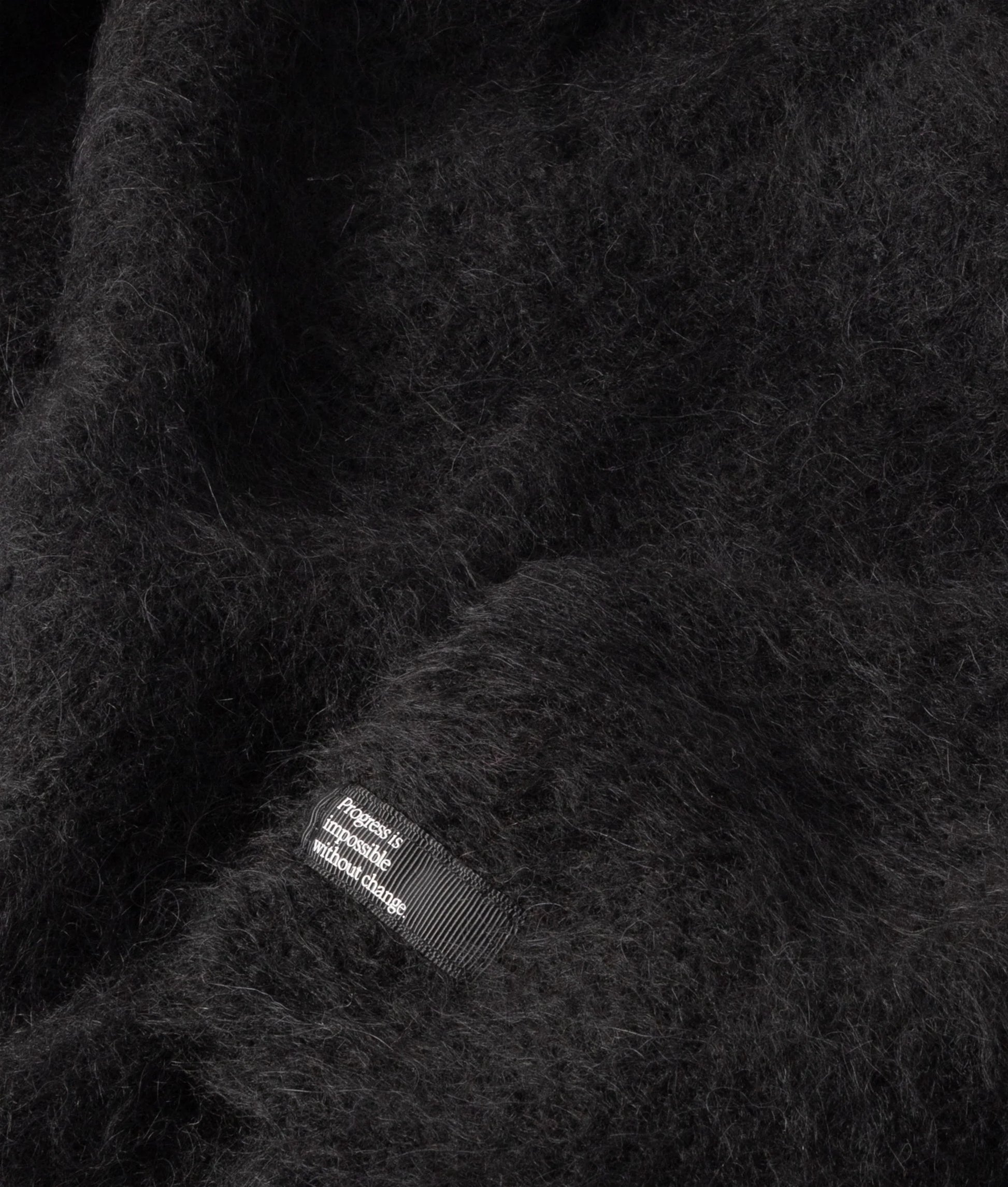 Suéter de punto de corte relajado y cuello en V, confeccionado en una cálida mezcla de lana de alpaca. Presenta terminaciones de punto acanalado ancho a lo largo del cuello, las mangas y el dobladillo, una etiqueta con el eslogan en la parte inferior de la manga izquierda y un logotipo de rayas pequeñas bordado en la espalda.