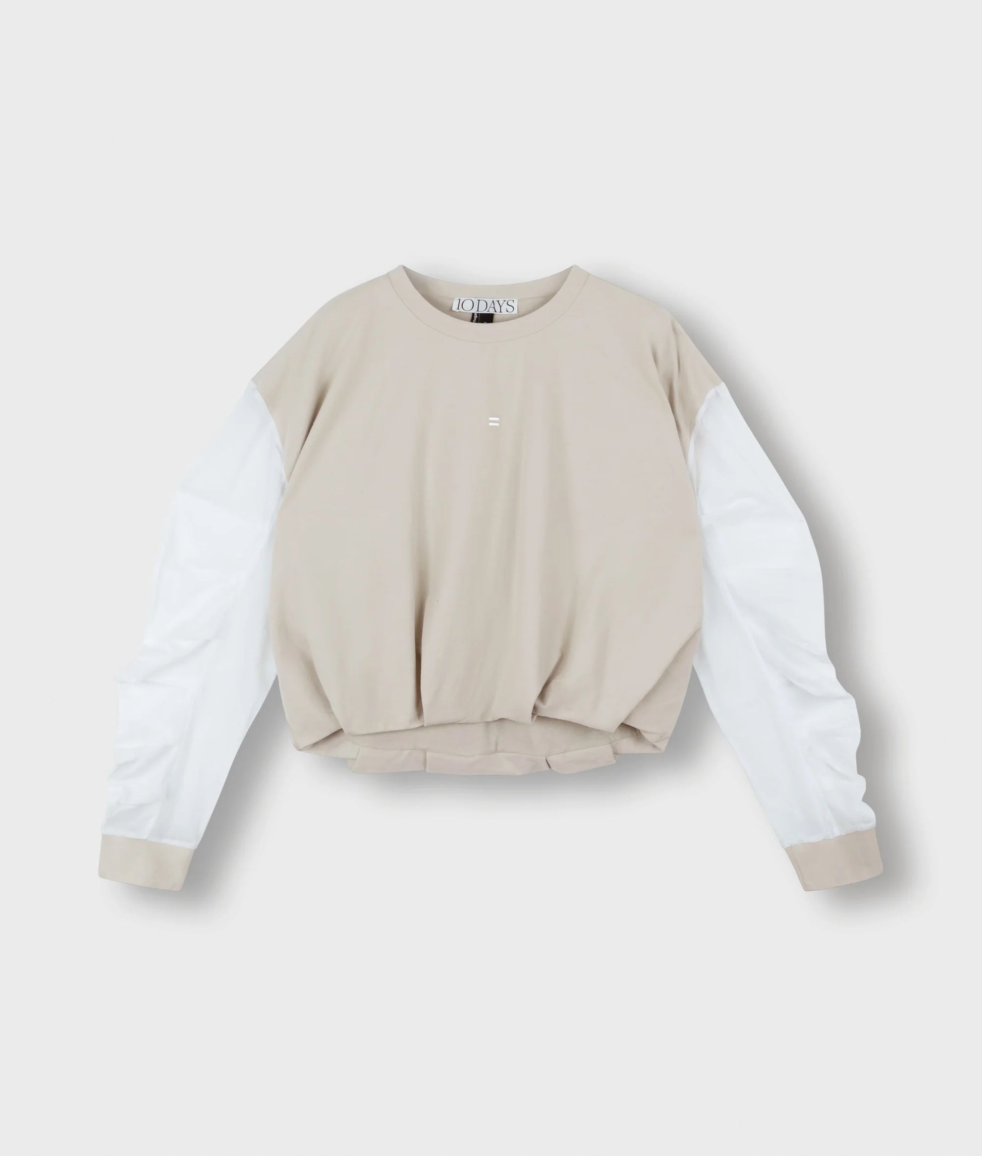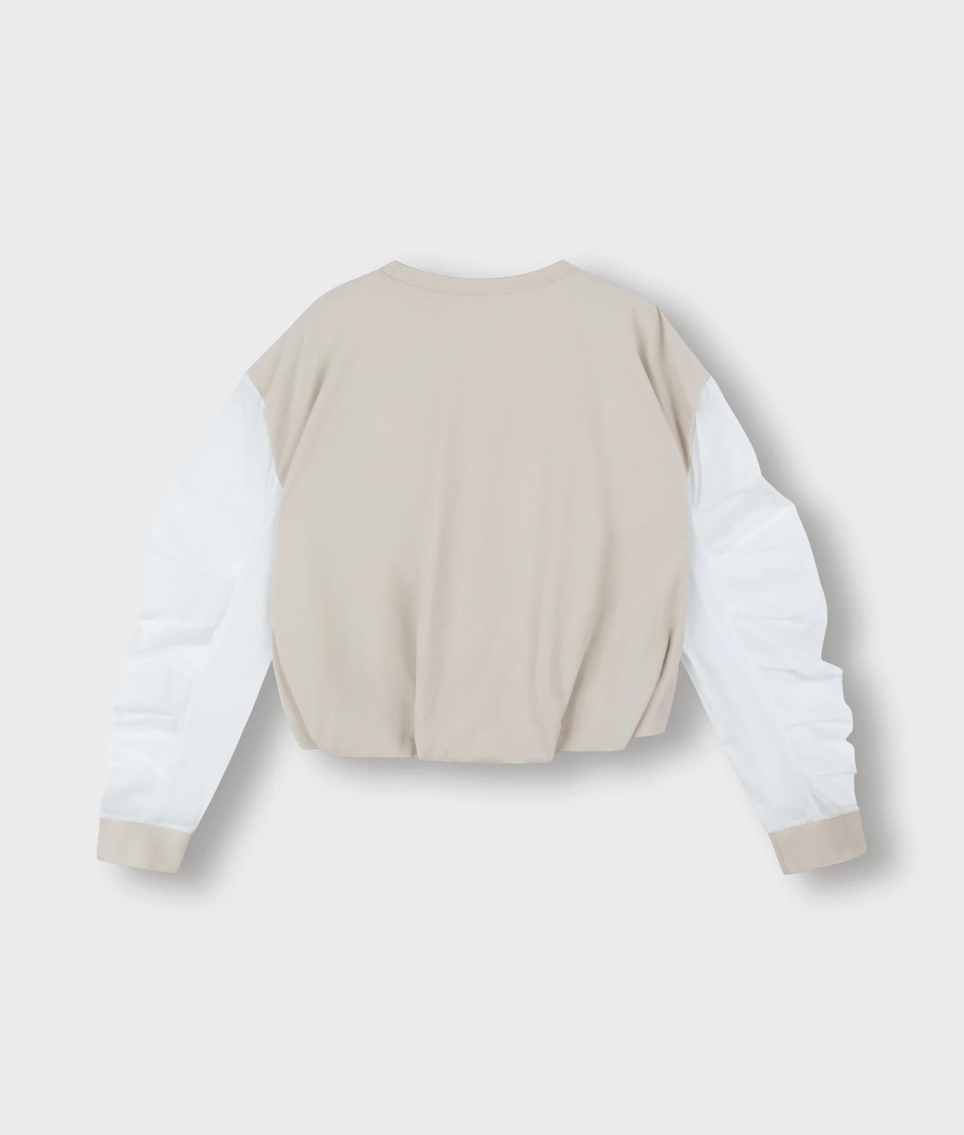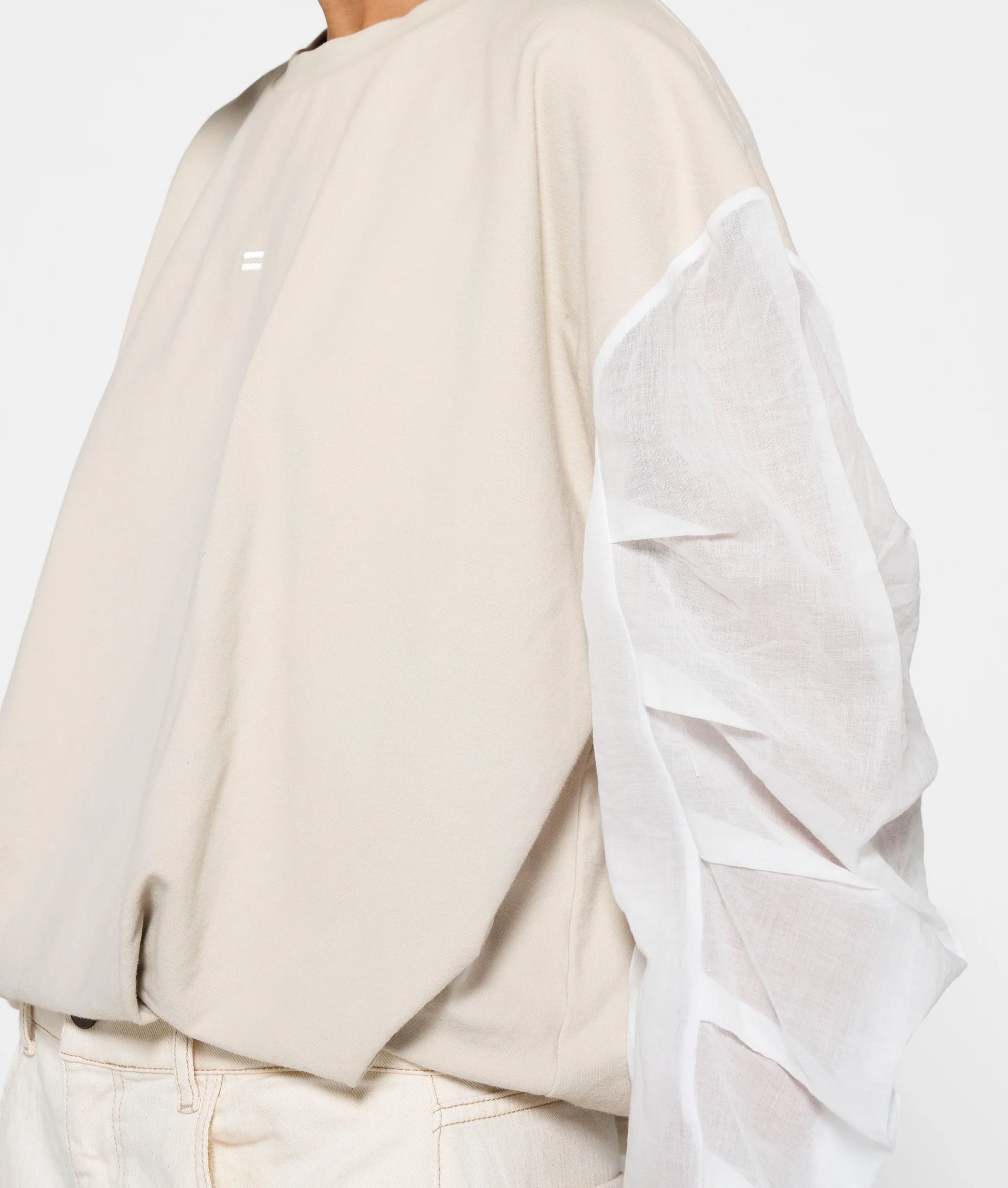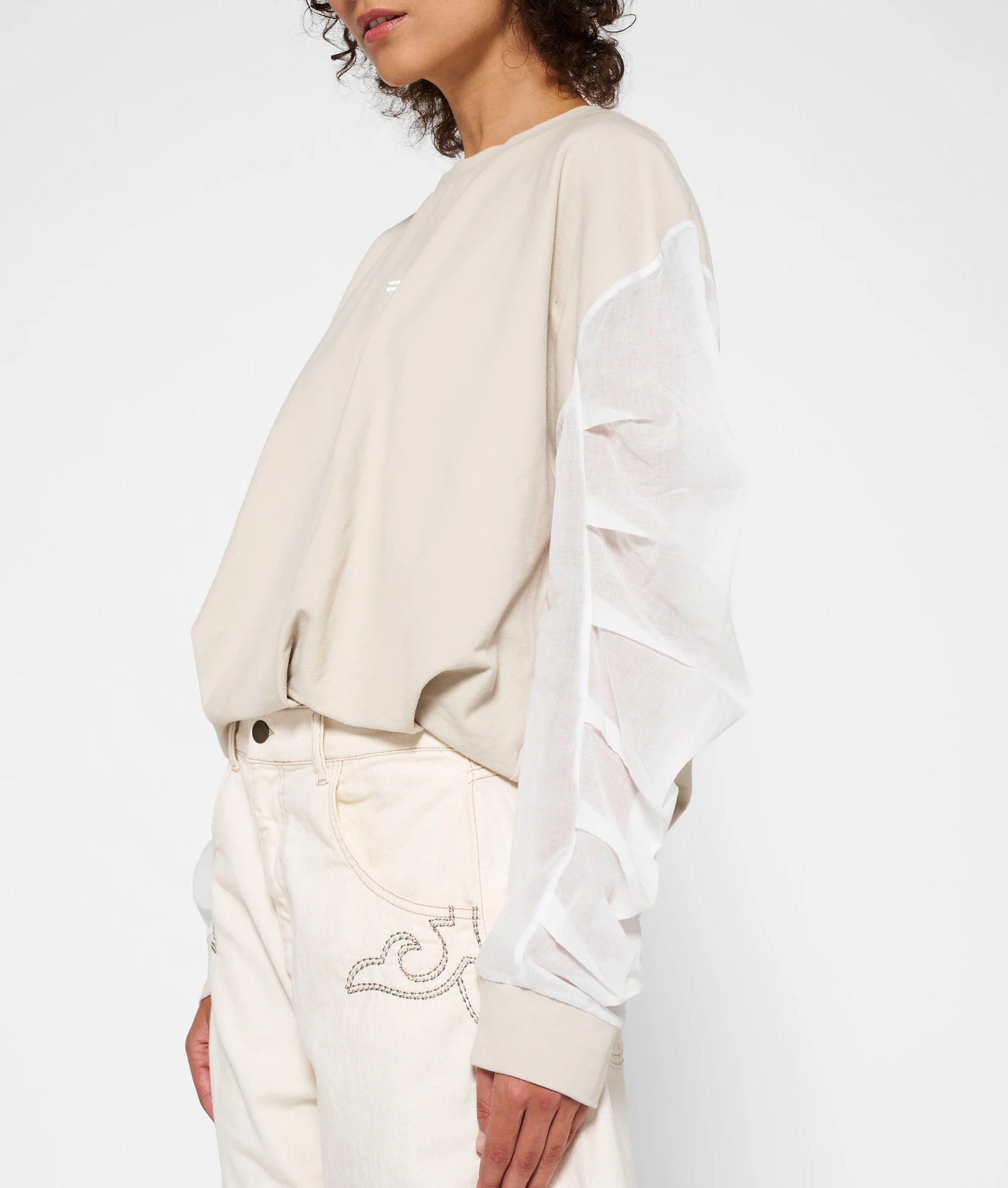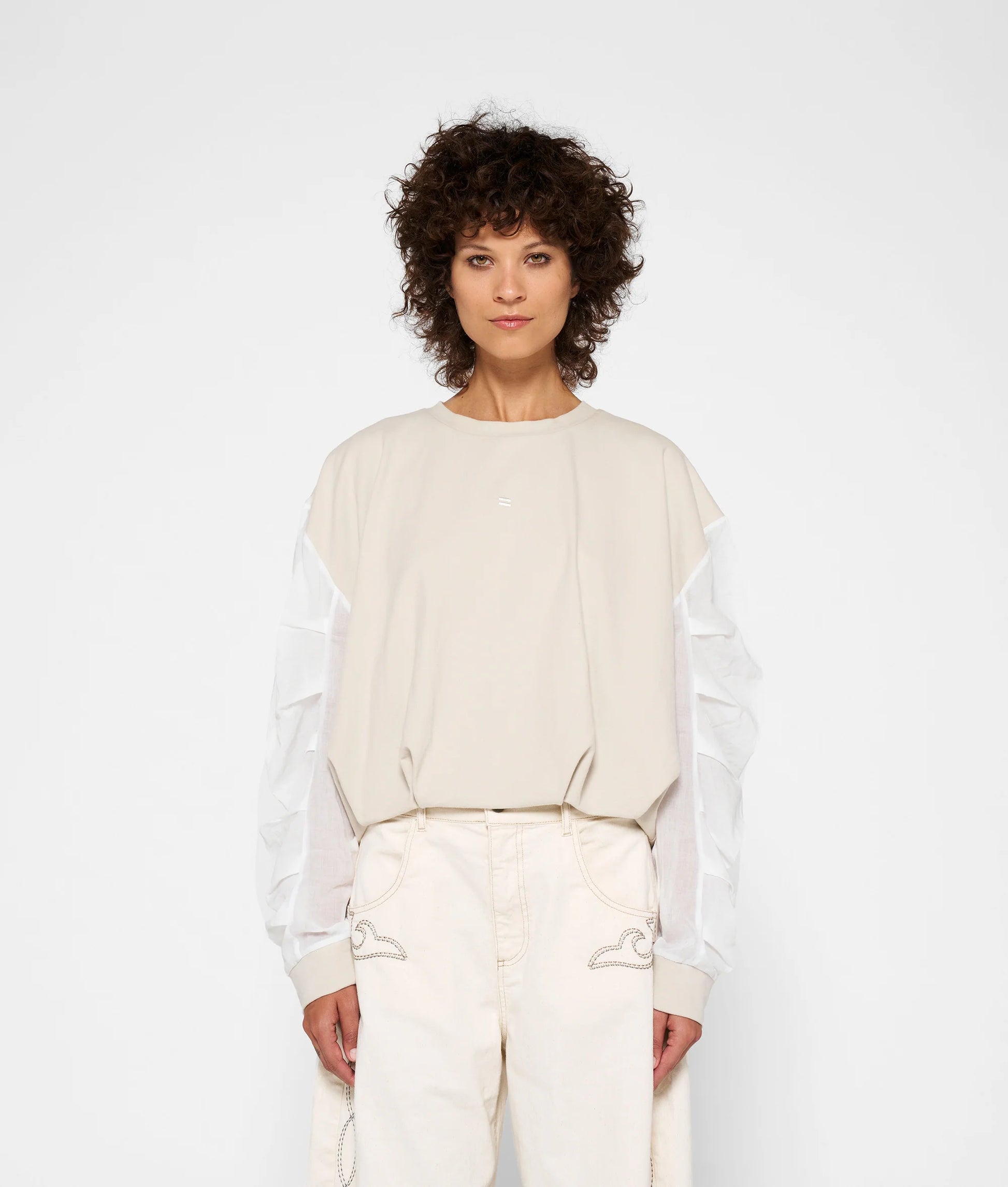 Jersey globo de corte relajado, confeccionado en felpa de algodón en el cuerpo y voile de algodón semitransparente en las mangas. Con pliegues en mangas y bajo, canesú bajo en el hombro y mini bordado de rayas en el pecho.