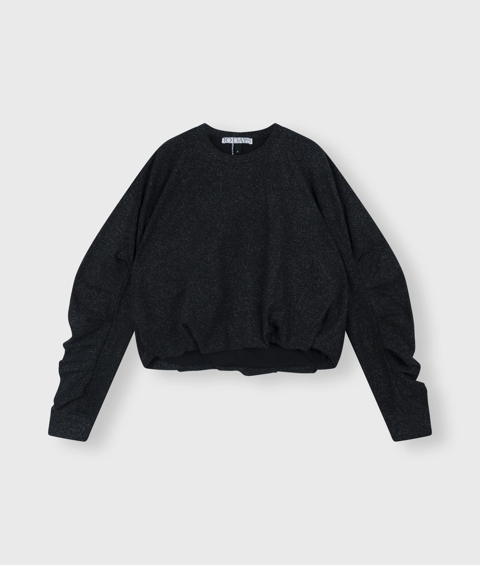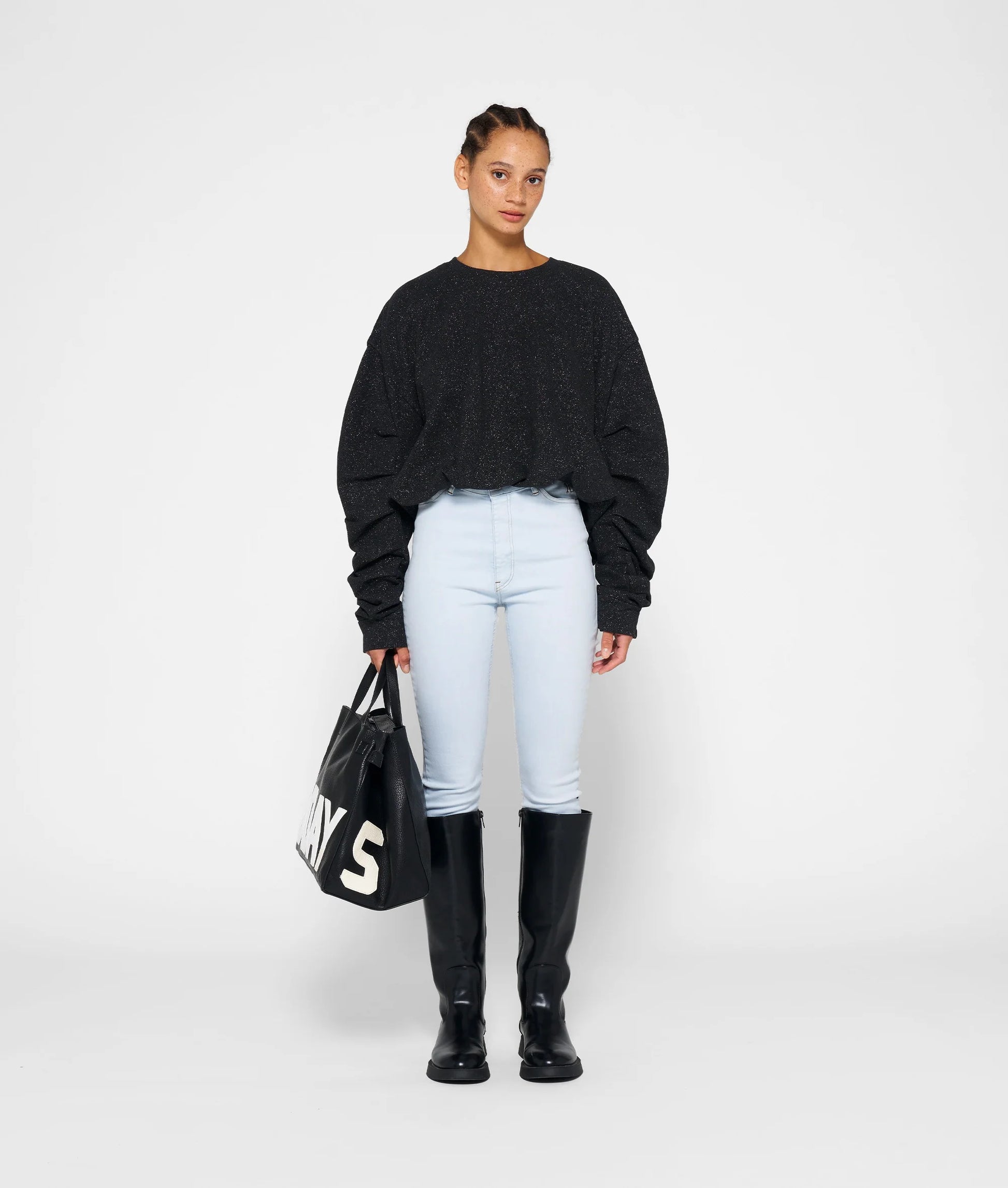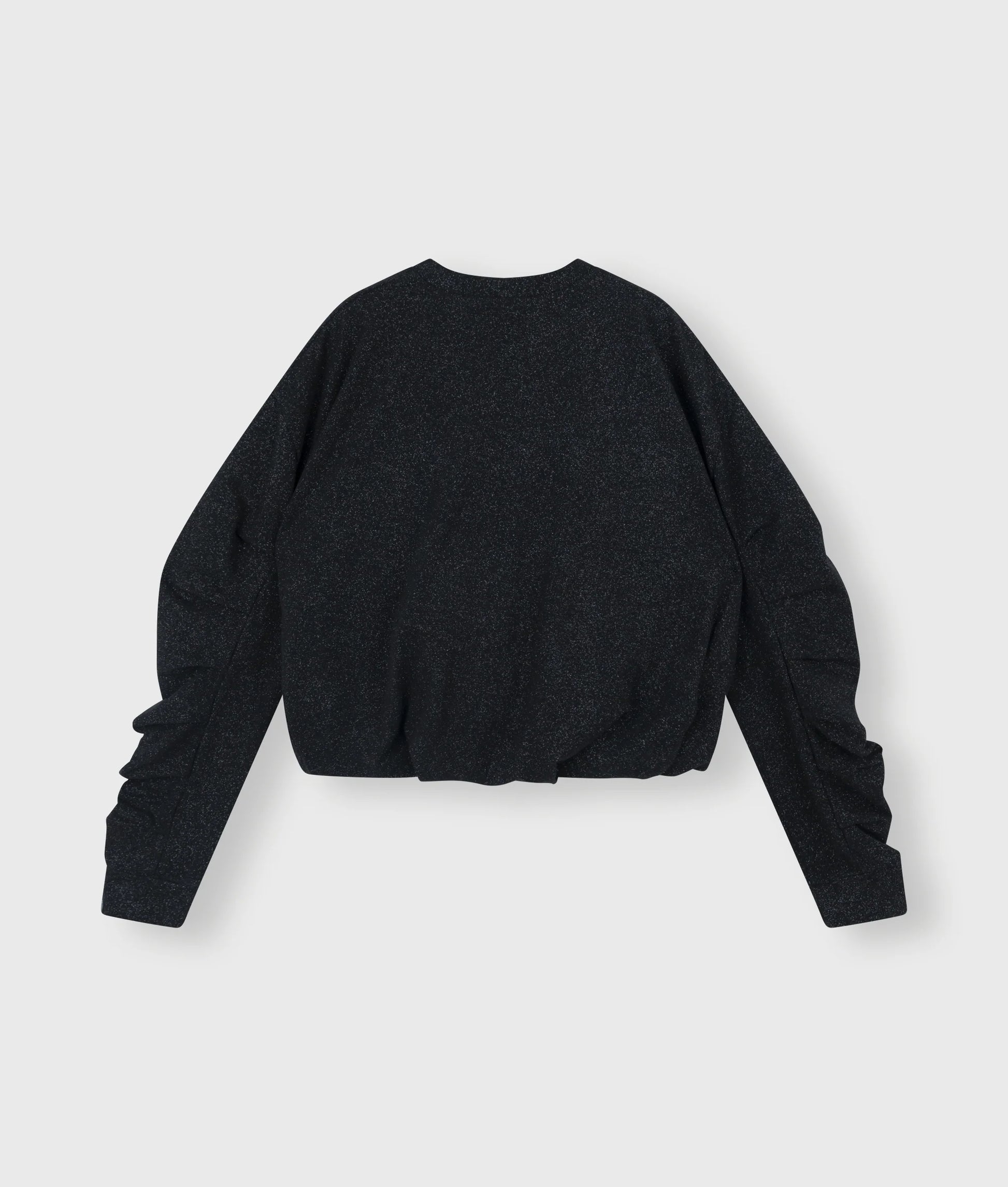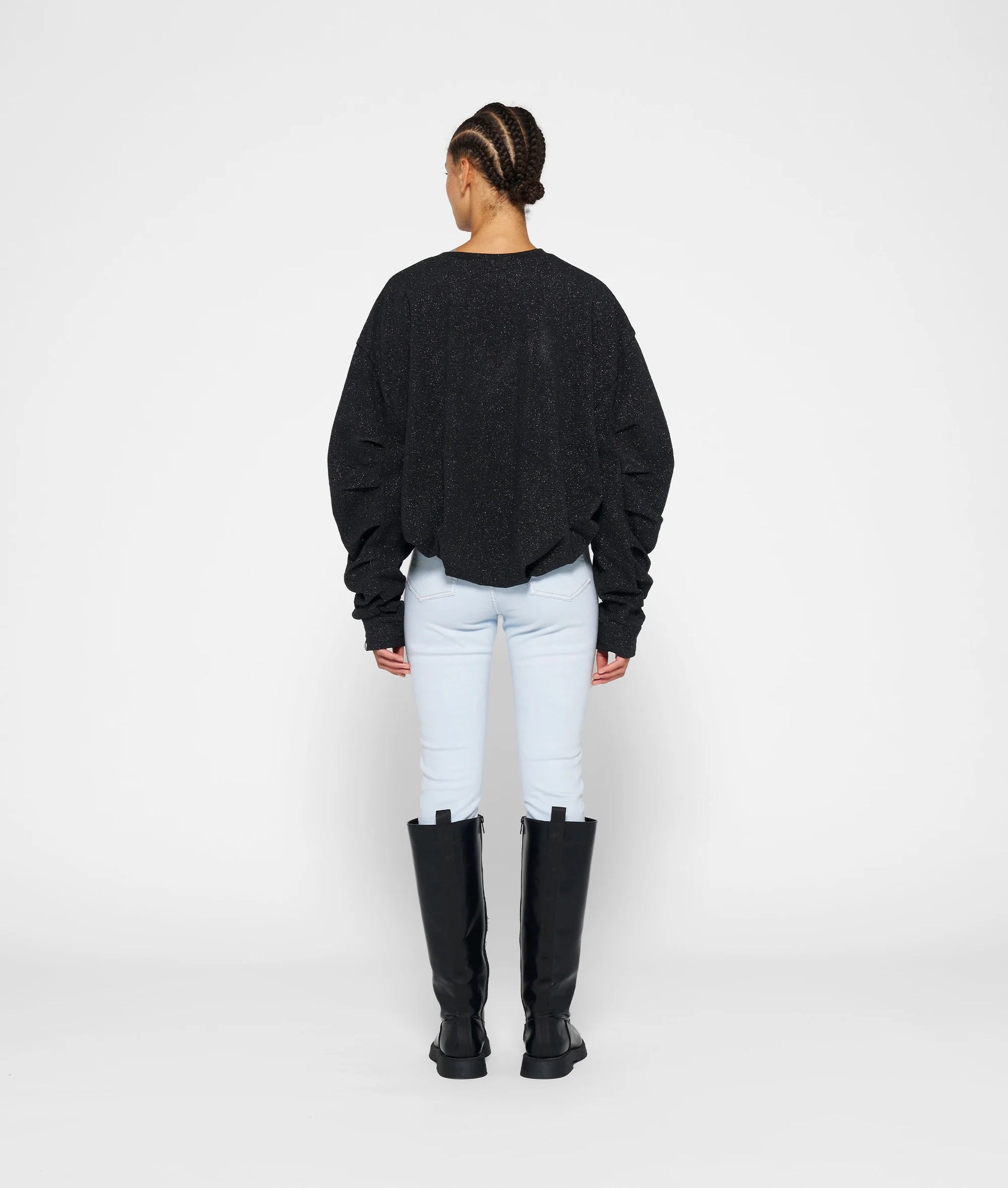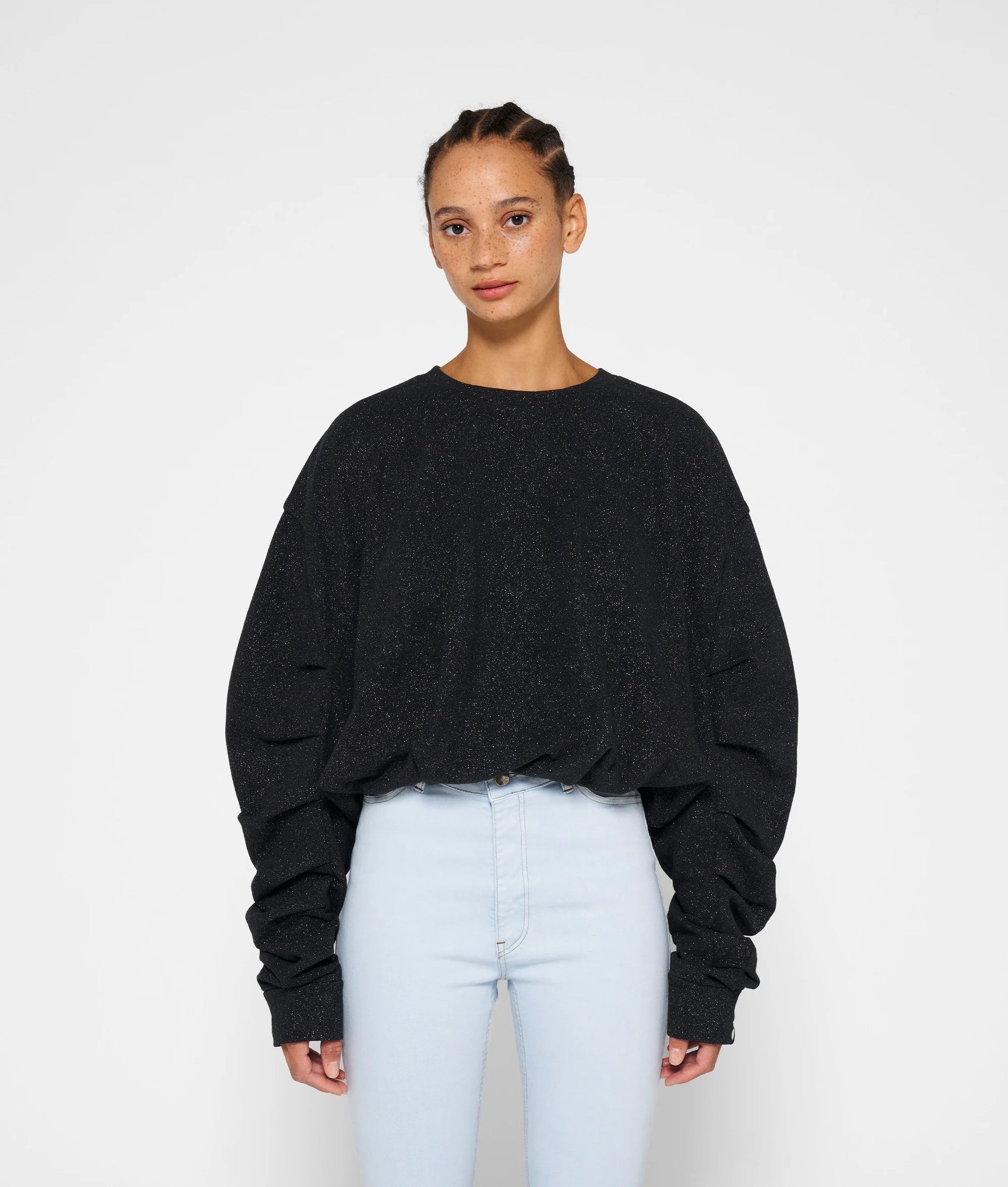 Jersey tipo globo de ajuste relajado, confeccionado con un tejido polar con purpurina en mezcla de algodón. Presenta pliegues en las mangas y el dobladillo, una aplicación baja en el hombro y una etiqueta con eslogan en la parte inferior de la manga izquierda