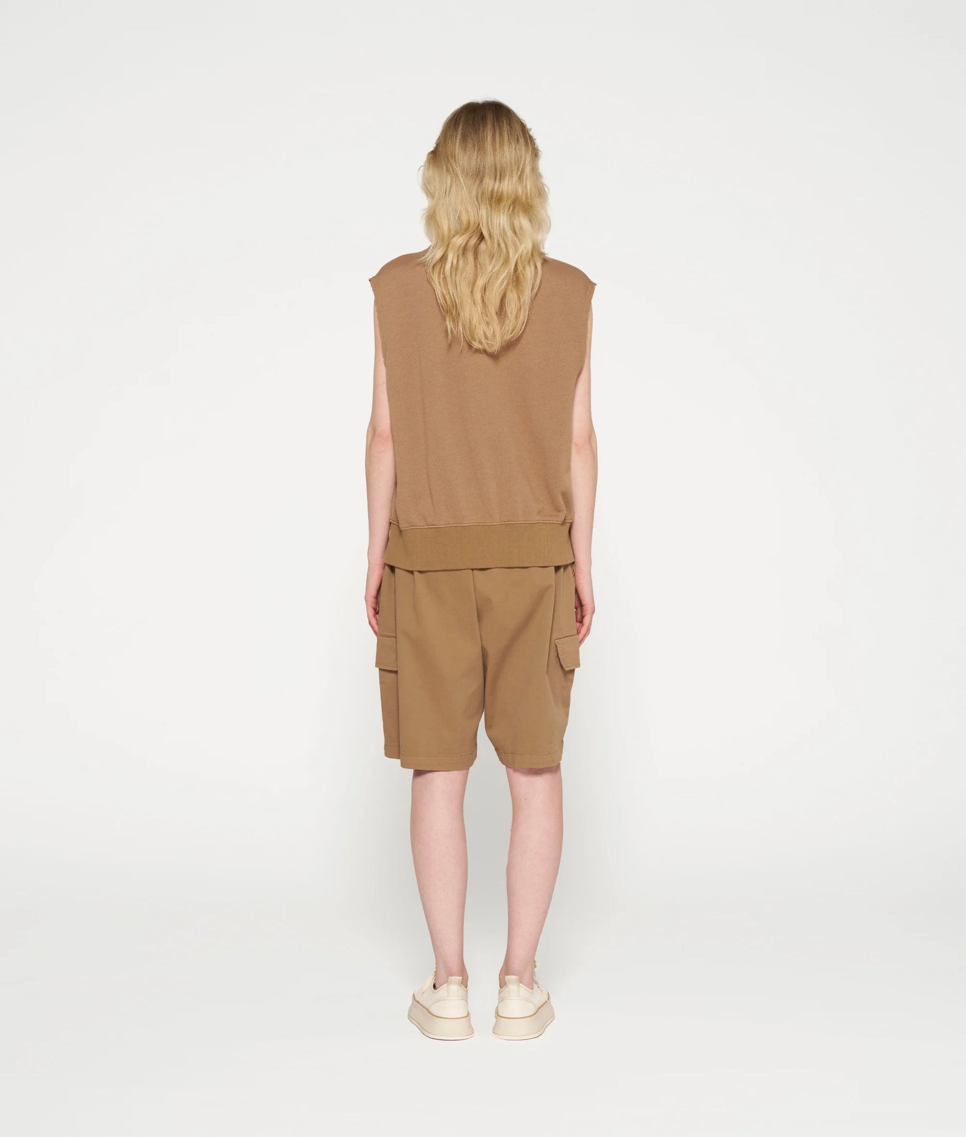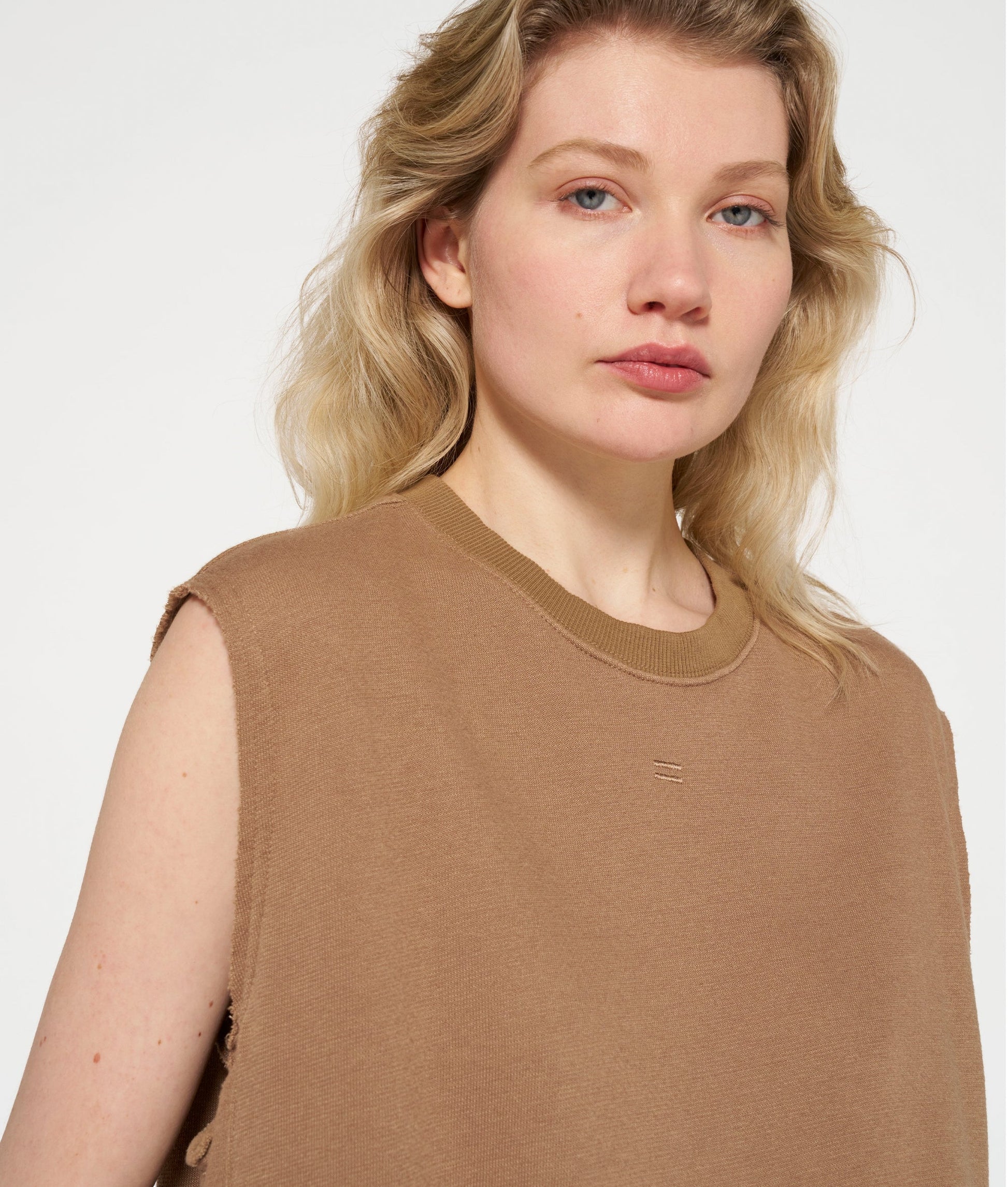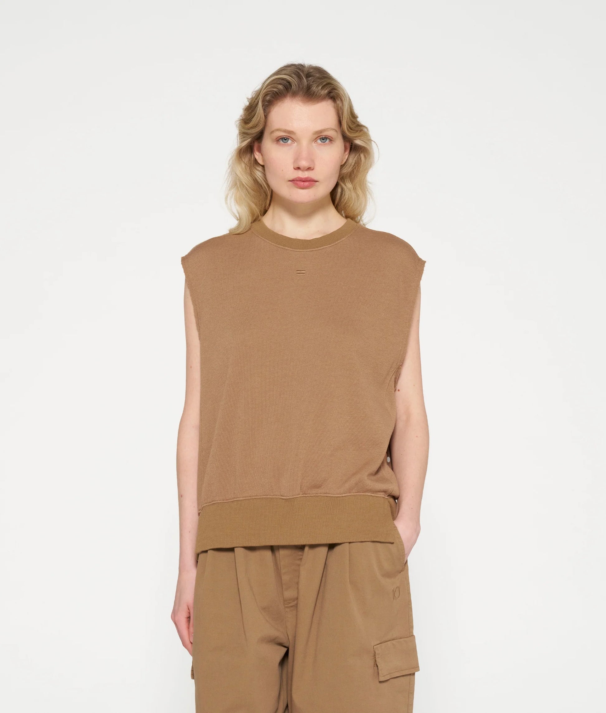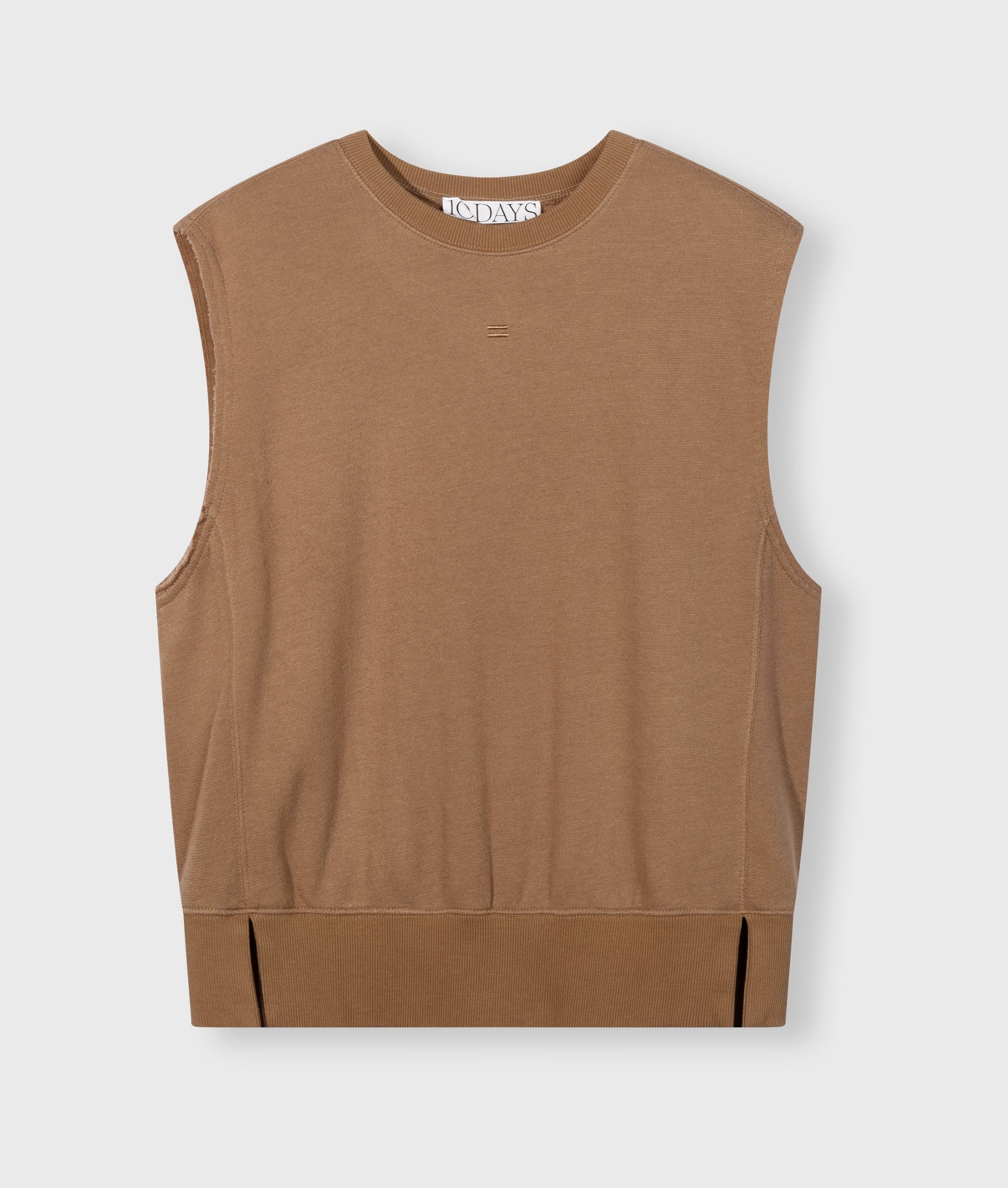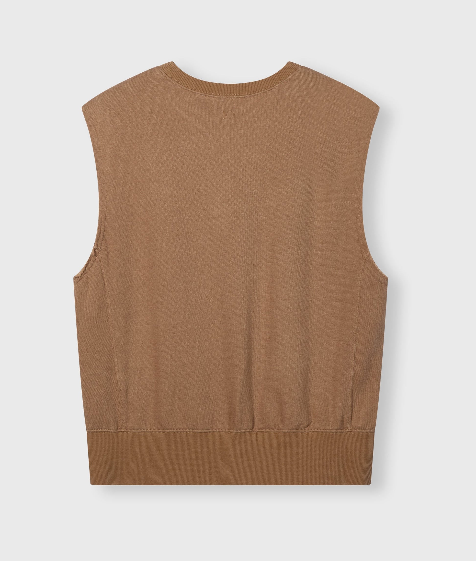 Jersey sin mangas de ajuste relajado en mezcla de poliéster y algodón de bambú cepillado. Presenta cuello redondo de punto de canalé, dobladillo de punto de canalé con pequeñas aberturas laterales, sisas con borde sin rematar, costuras laterales delanteras, un logo de mini rayas bordado en el pecho y un logo "10" bordado en la espalda.