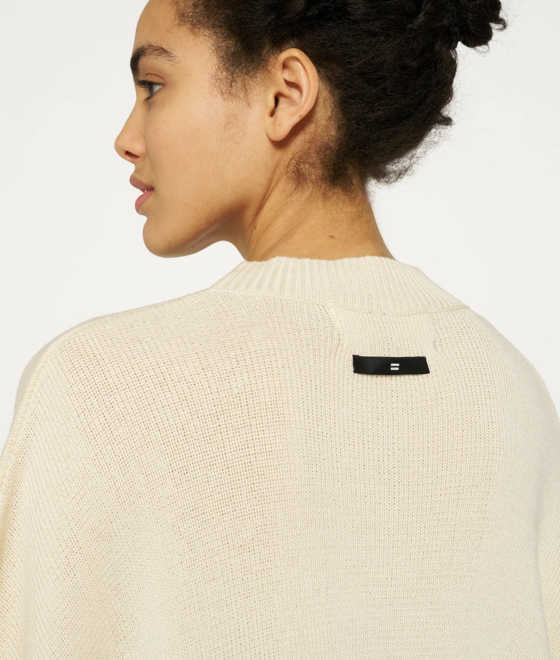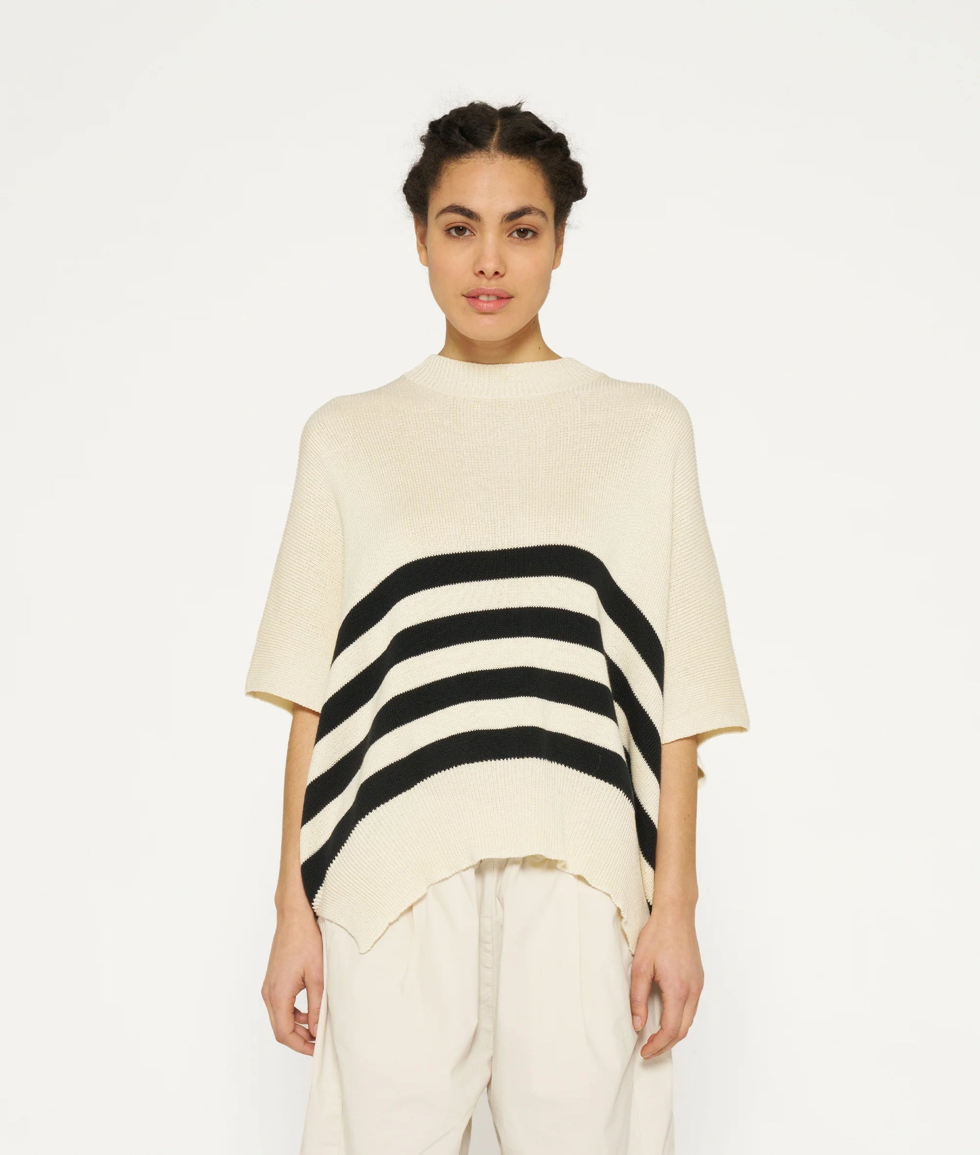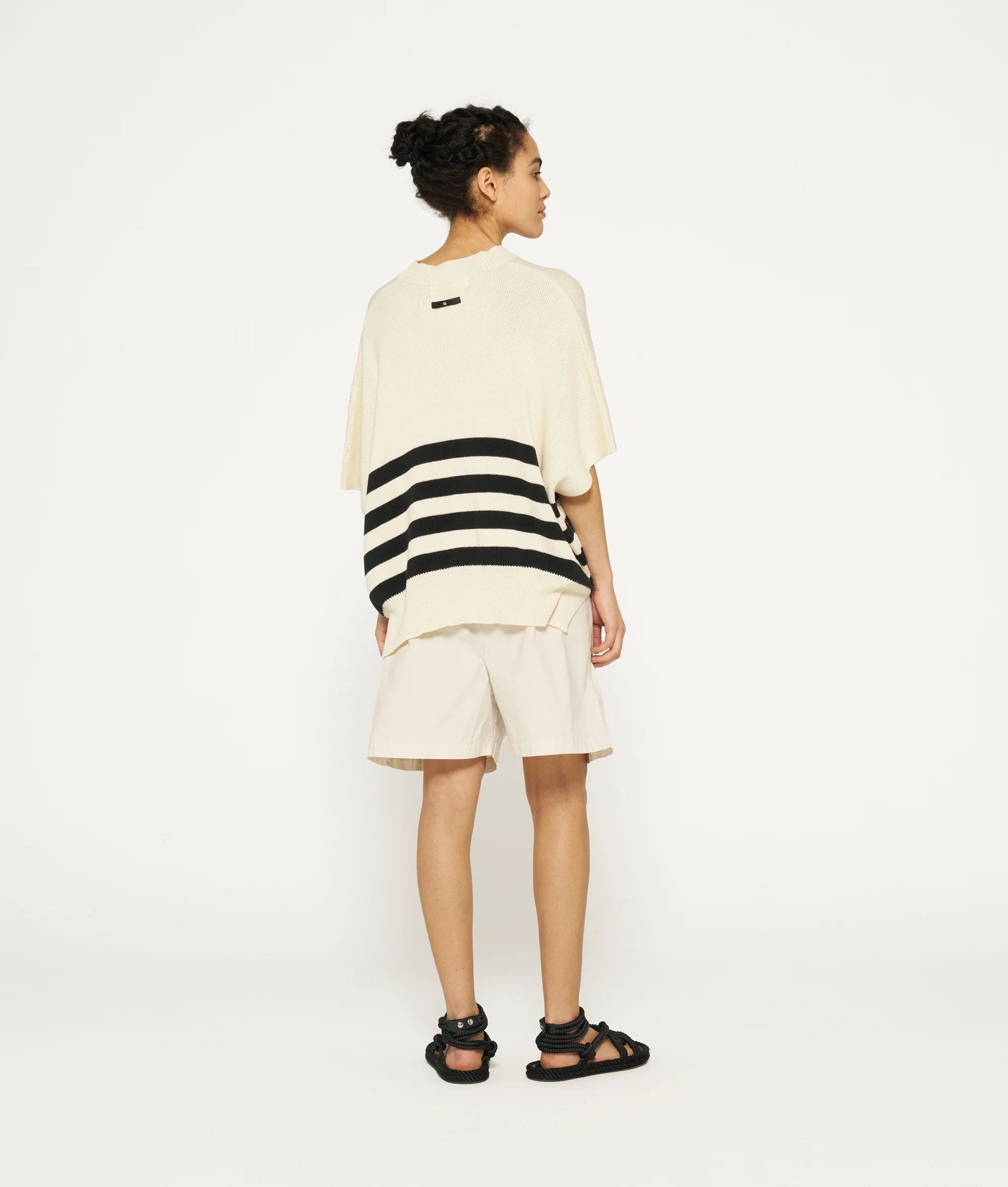 Top de punto de corte relajado y manga corta inclinada, confeccionado en una mezcla de algodón. Presenta cuello redondo en punto de canalé, bajo ancho en punto de canalé, aberturas laterales y etiqueta en la espalda.